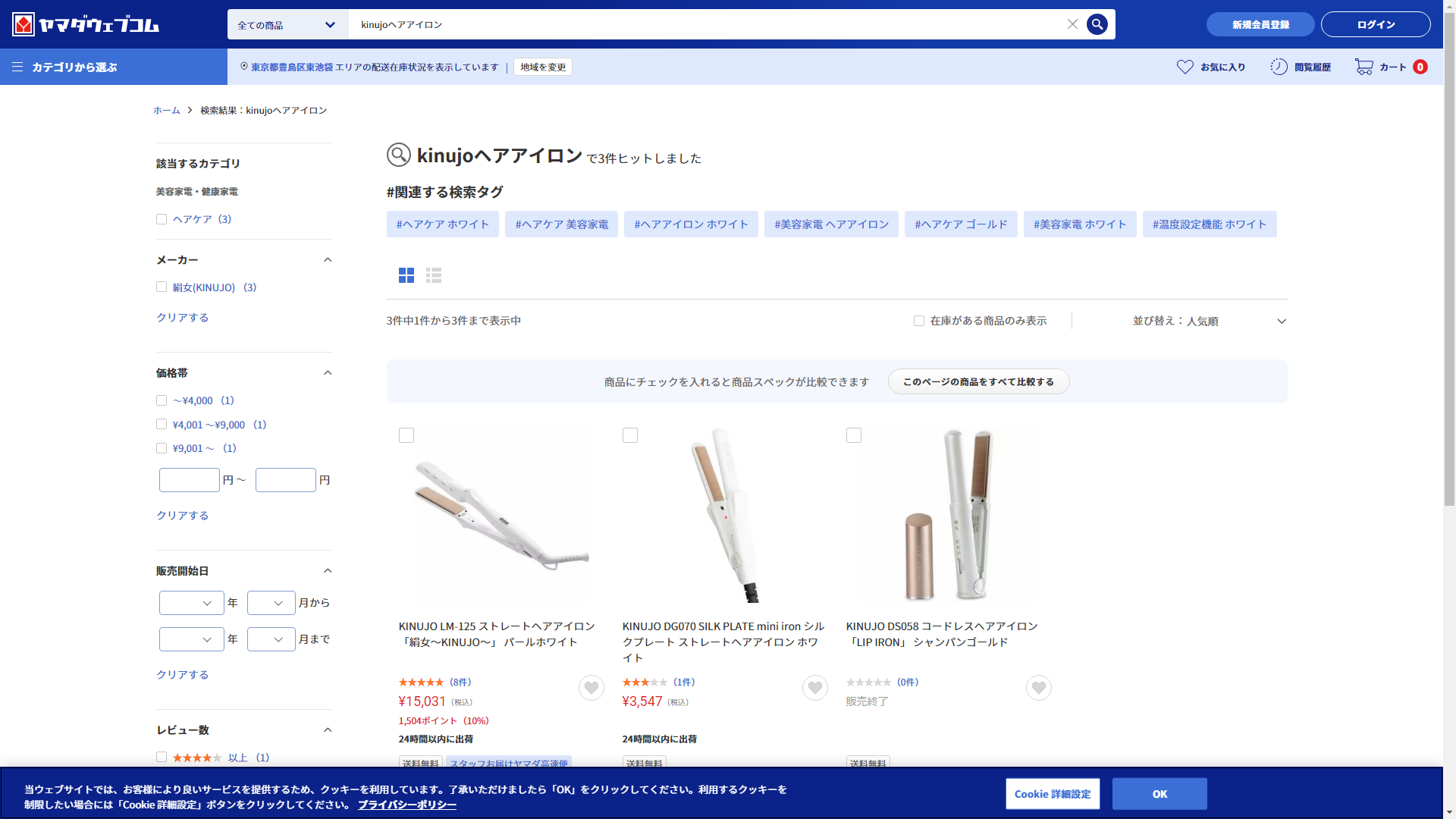 お調べしたところ現在、ヤマダデンキではkinujoヘアアイロンに関連する商品を買うことが可能です。