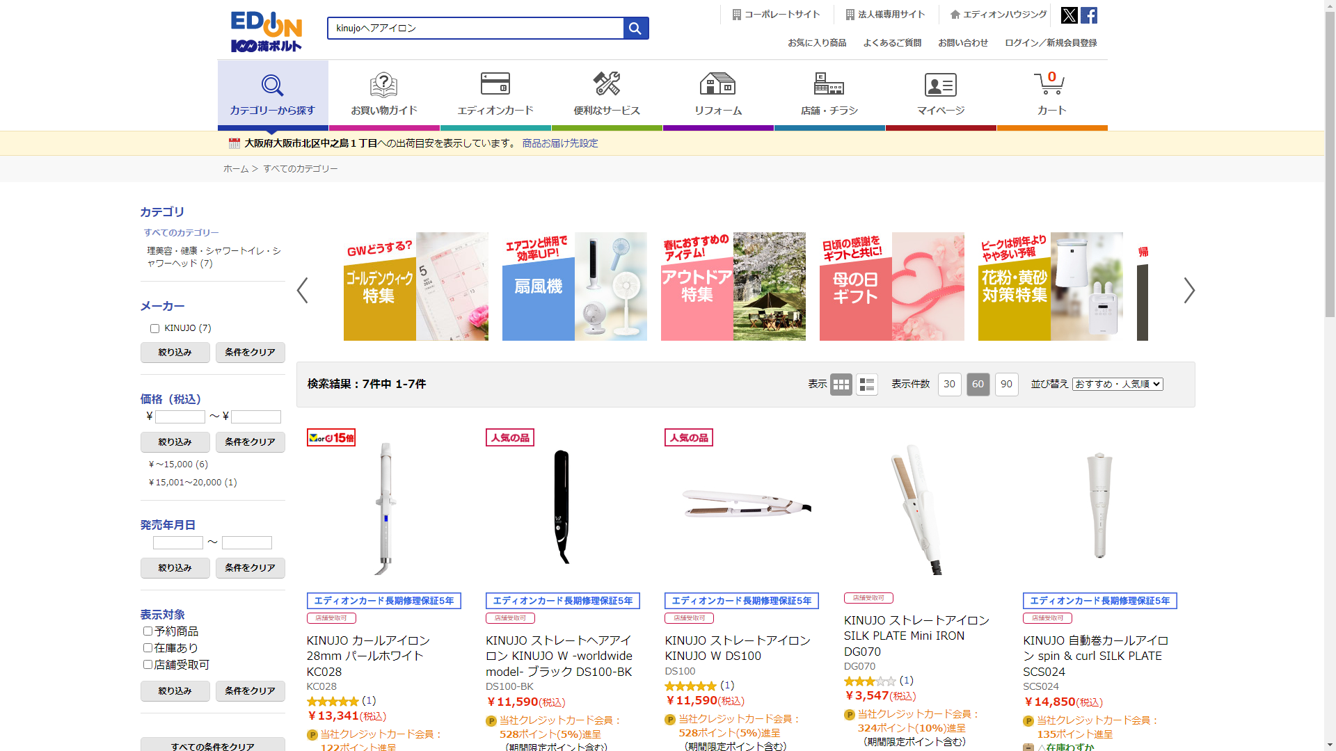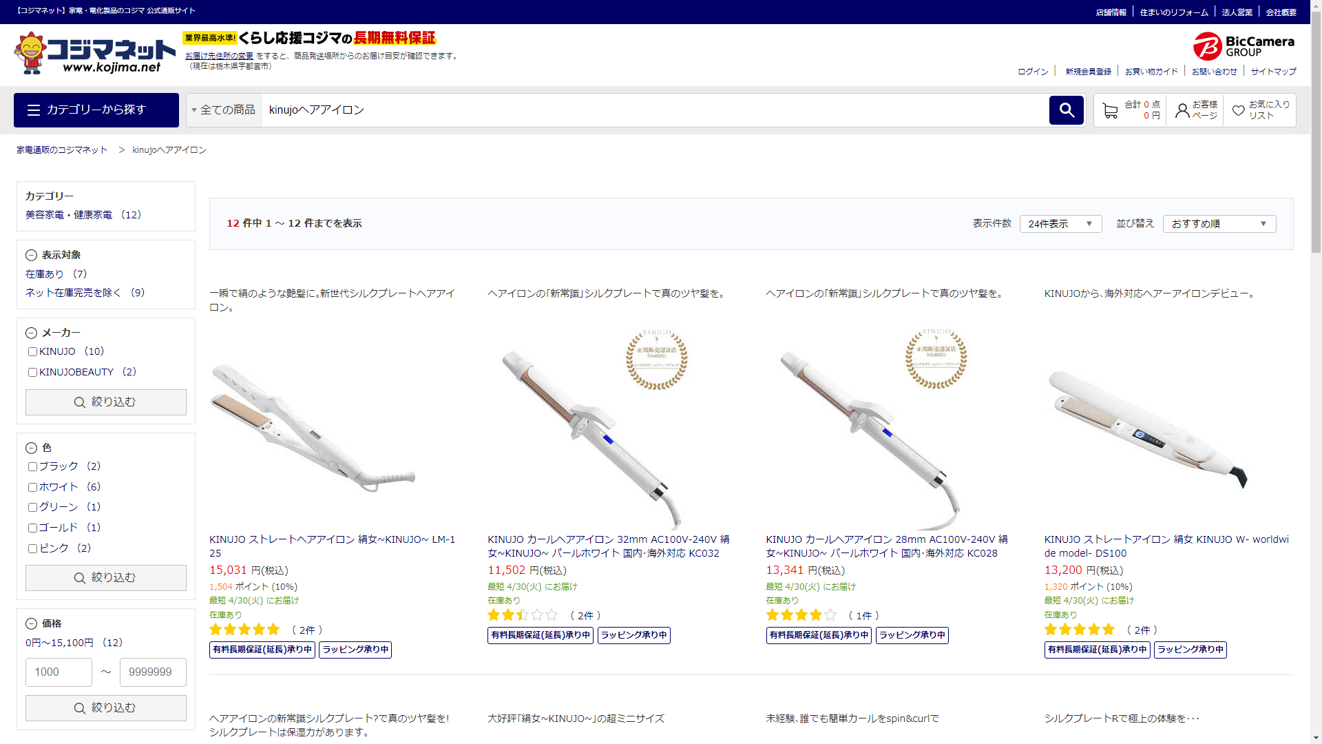 お調べしたところ現在、家電・電化製品のコジマではkinujoヘアアイロンの関連する商品が販売されています。