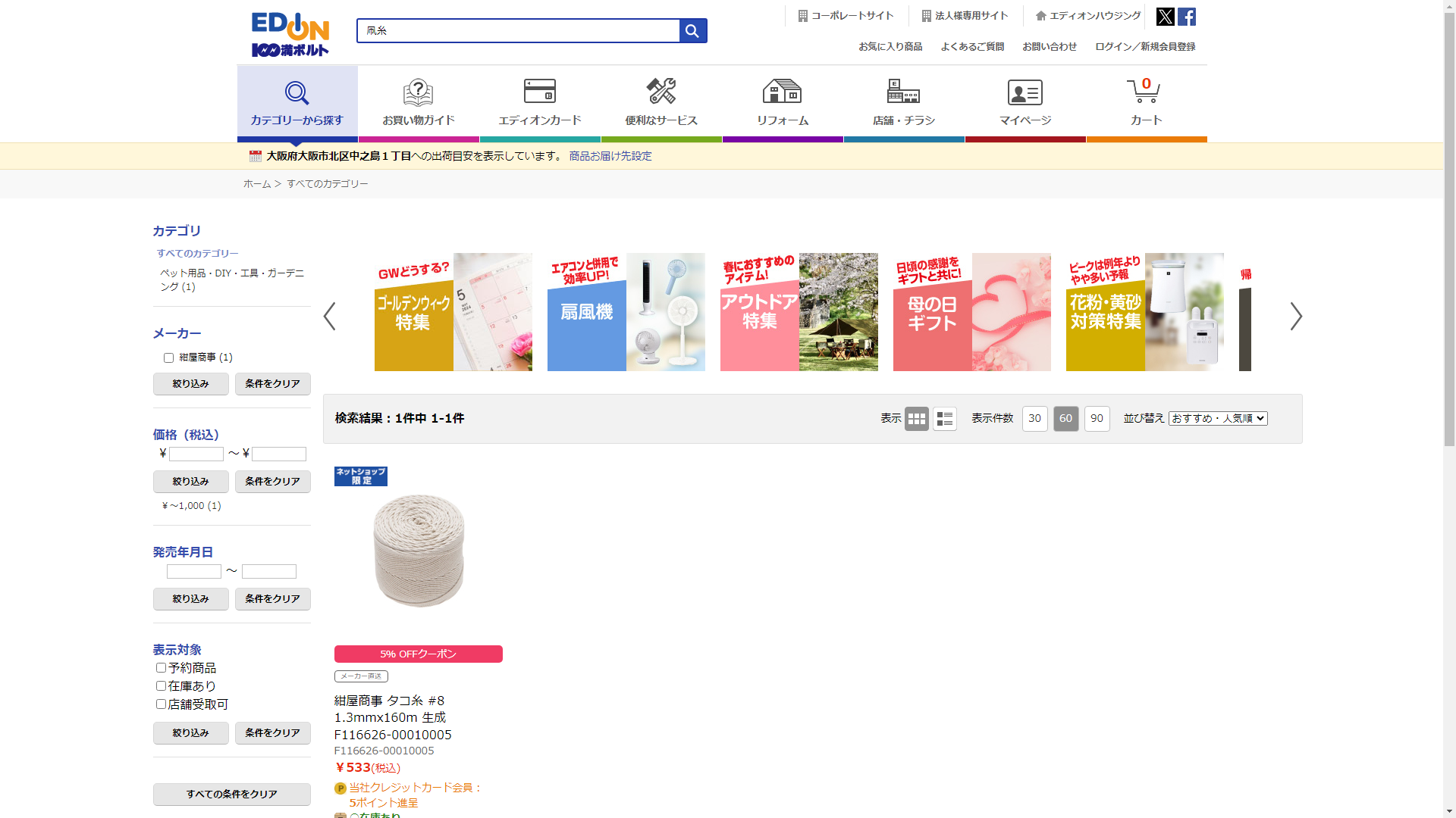 お調べしたところ現在、EDIONでは凧糸の関連する商品が販売されています。