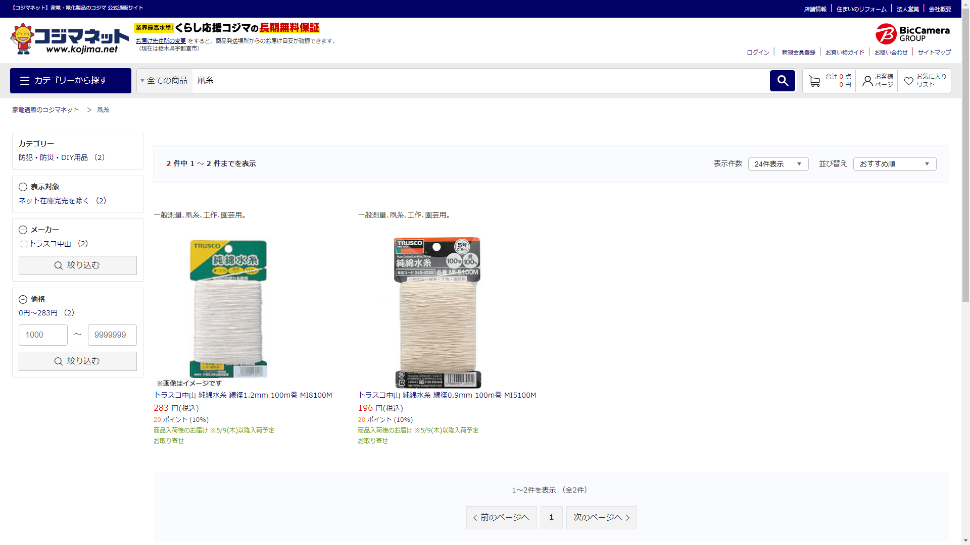お調べしたところ現在、家電・電化製品のコジマでは凧糸に関連する商品が販売されています。