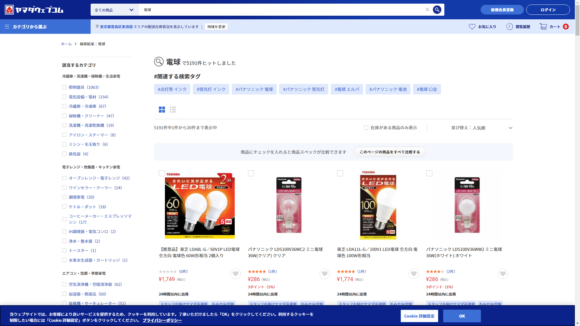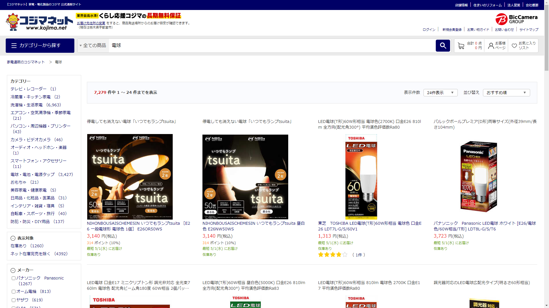 お調べしたところ現在、家電・電化製品のコジマでは電球の関連する商品が販売されています。