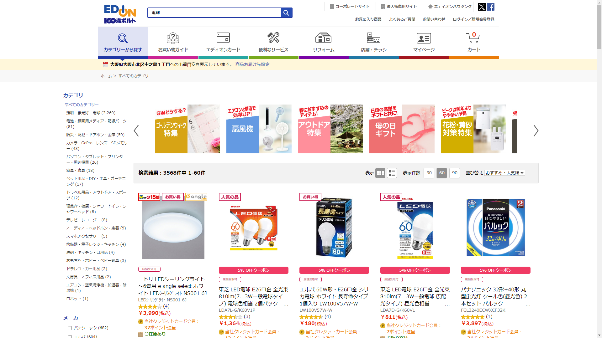お調べしたところ現在、EDIONでは電球に関連する商品が販売されています。