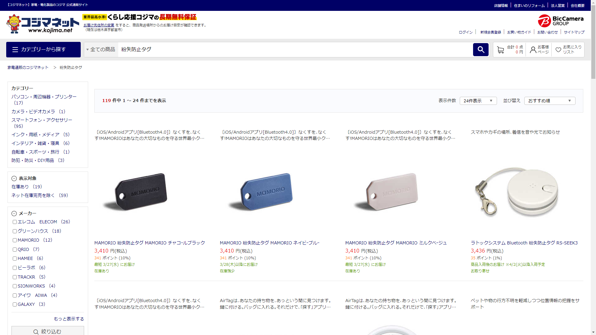 紛失防止タグは家電・電化製品のコジマに売っています