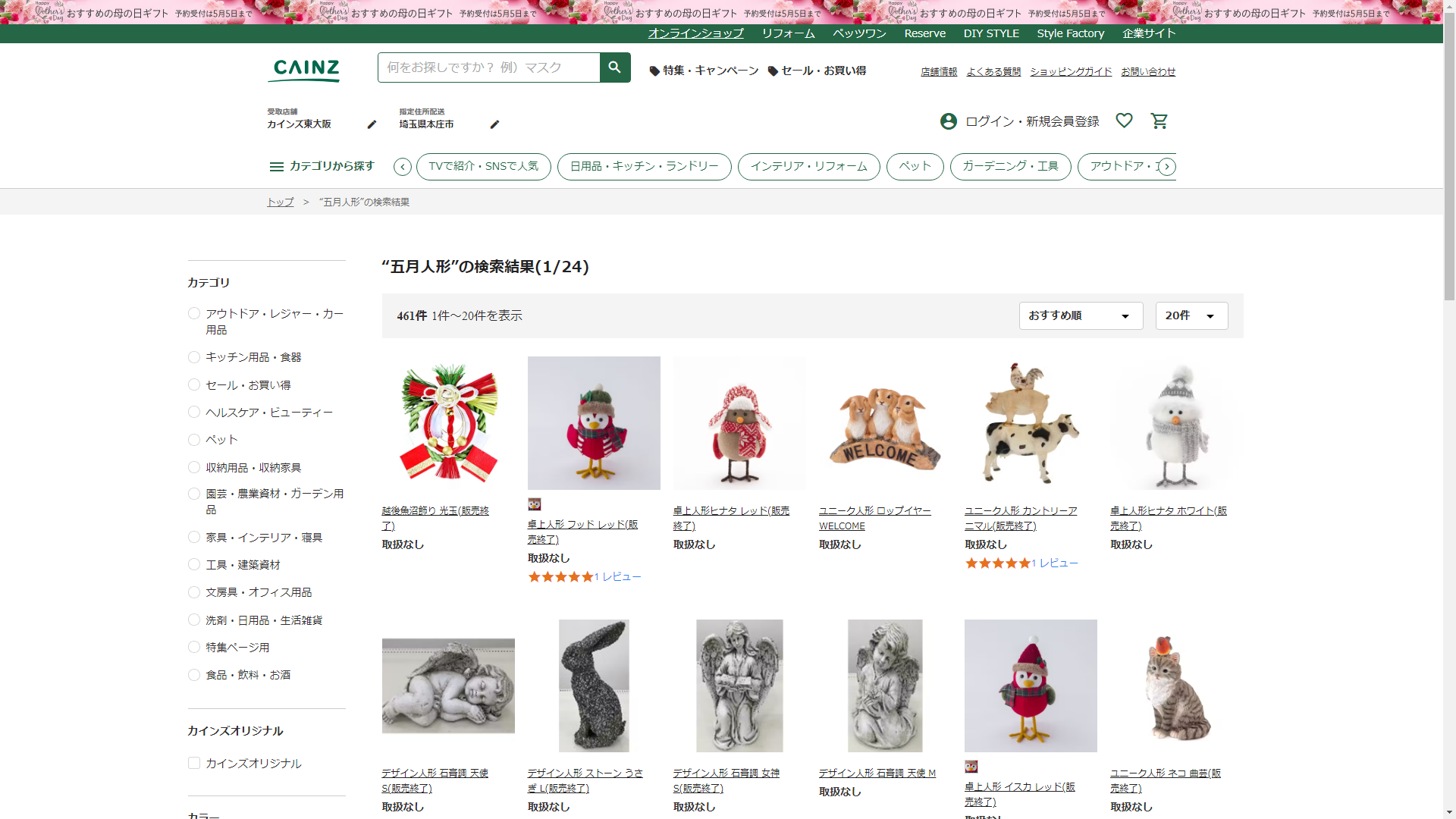 お調べしたところ現在、CAINZでは五月人形の関連する商品が販売されています。