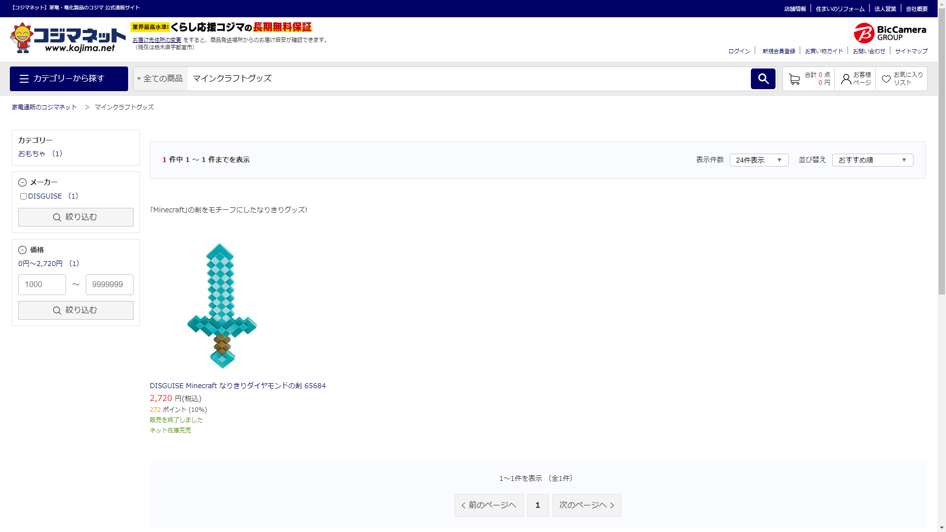 お調べしたところ現在、家電・電化製品のコジマではマインクラフトグッズに関連する商品が販売されています。