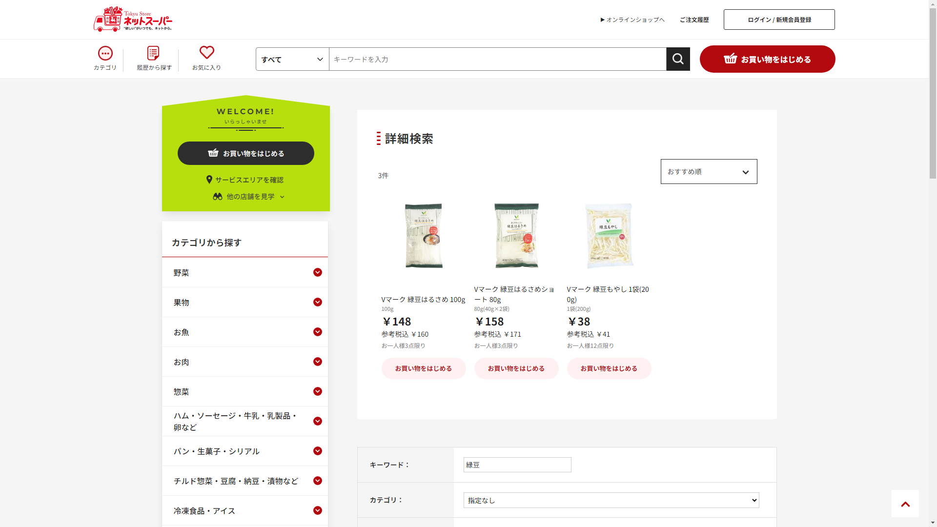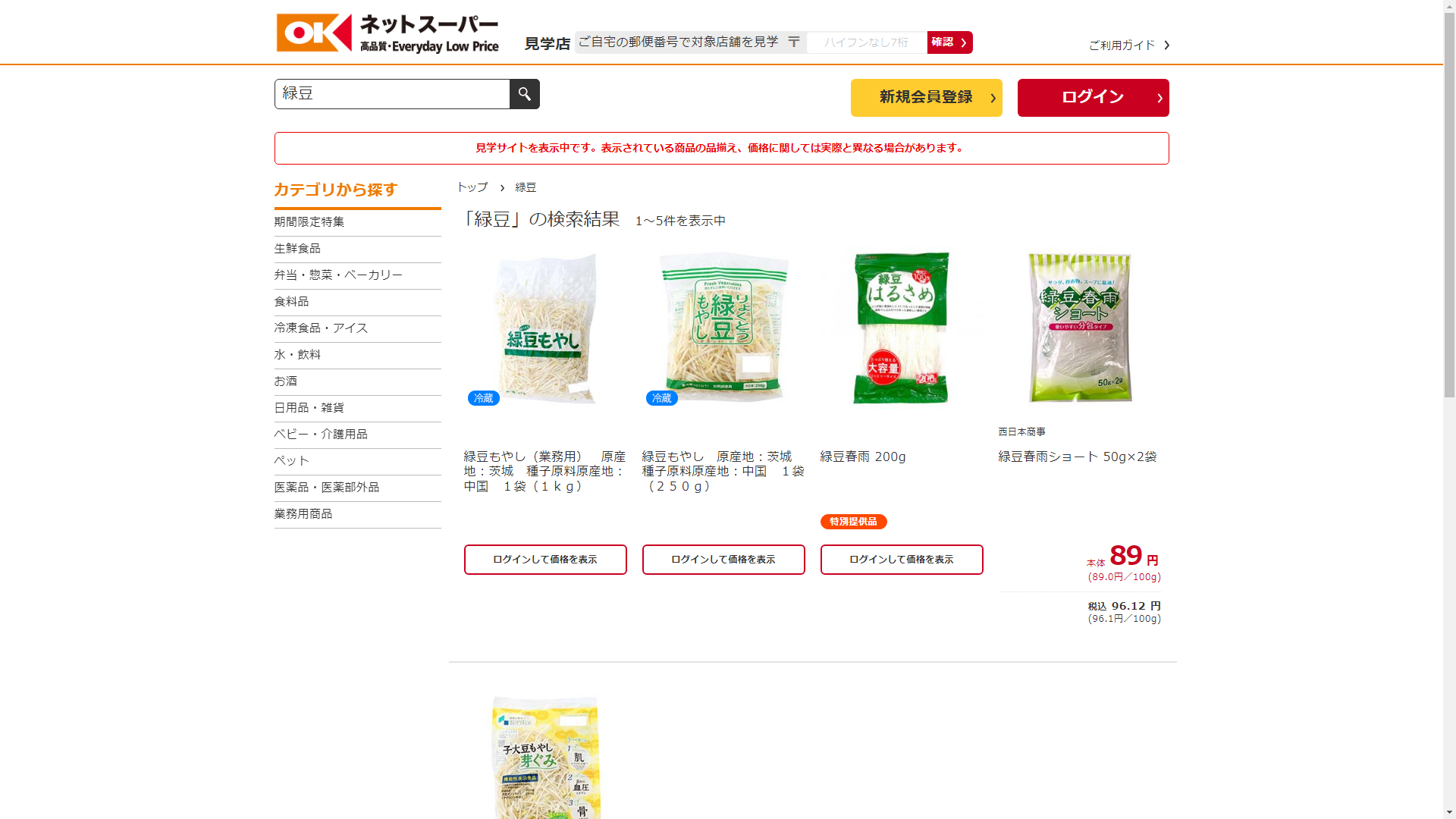 お調べしたところ現在OKネットスーパーでは緑豆に関連する商品が販売されています。
