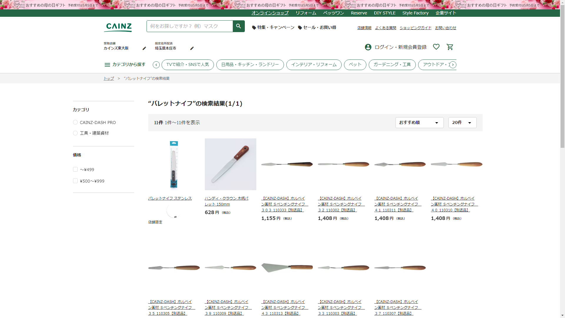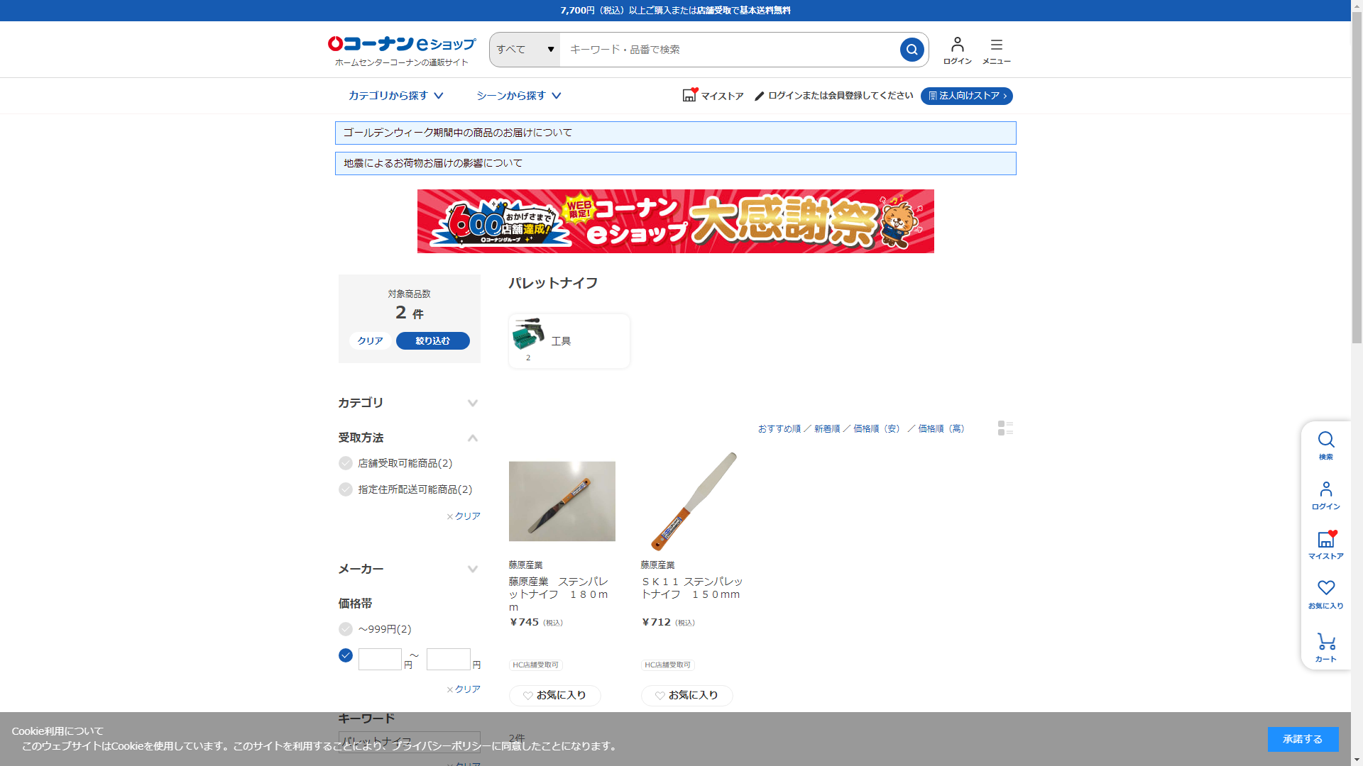 お調べしたところ現在、ホームセンターコーナンではパレットナイフに関連する商品を買うことが可能です。