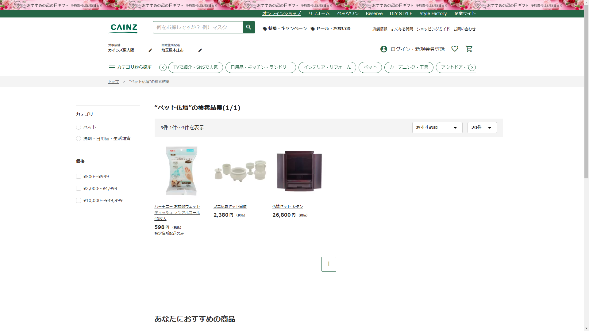 ペット仏壇はCAINZに売っています