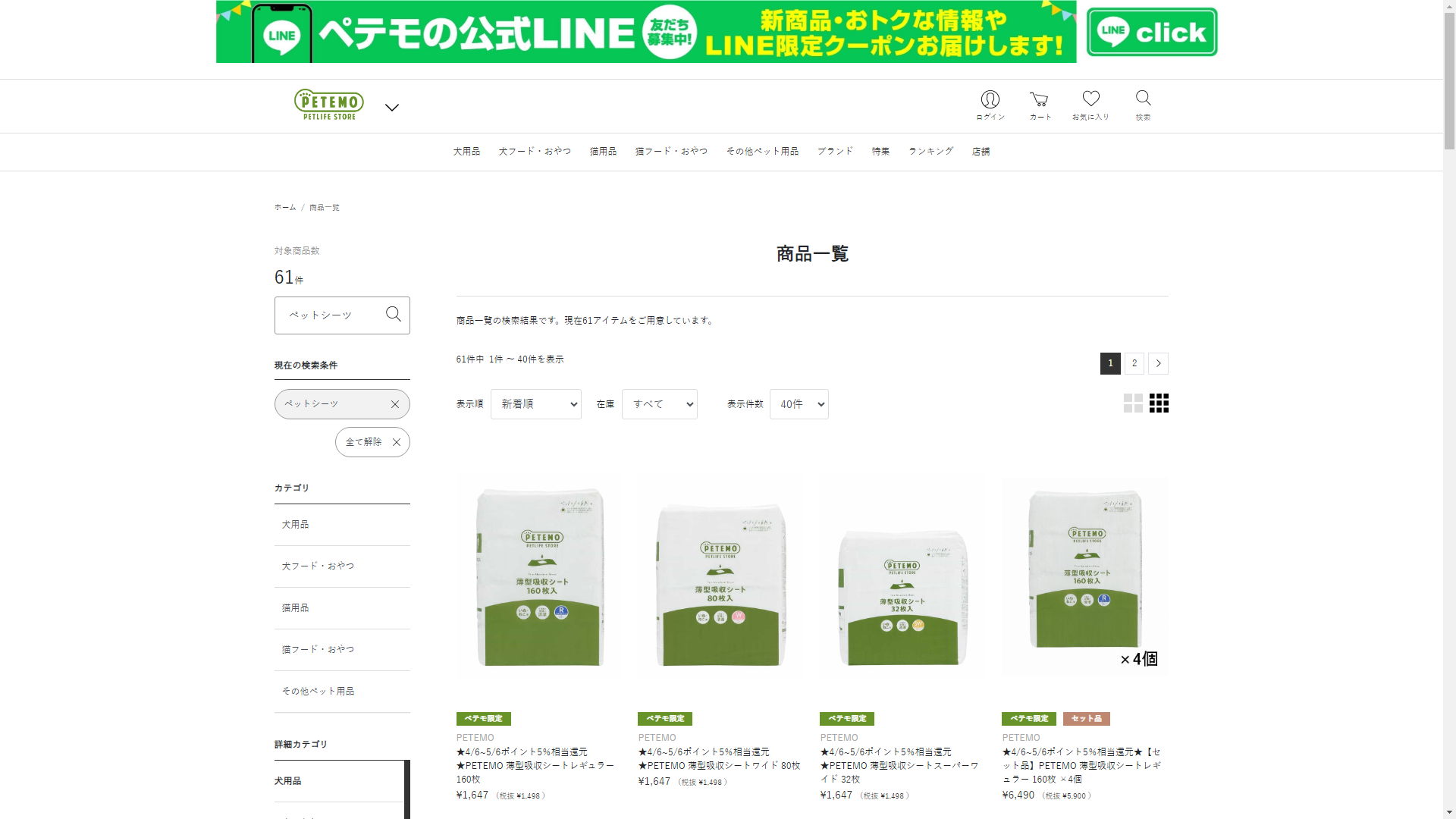 お調べしたところ現在、PETEMO(ペテモ)ではペットシーツに関連する商品を買うことが可能です。