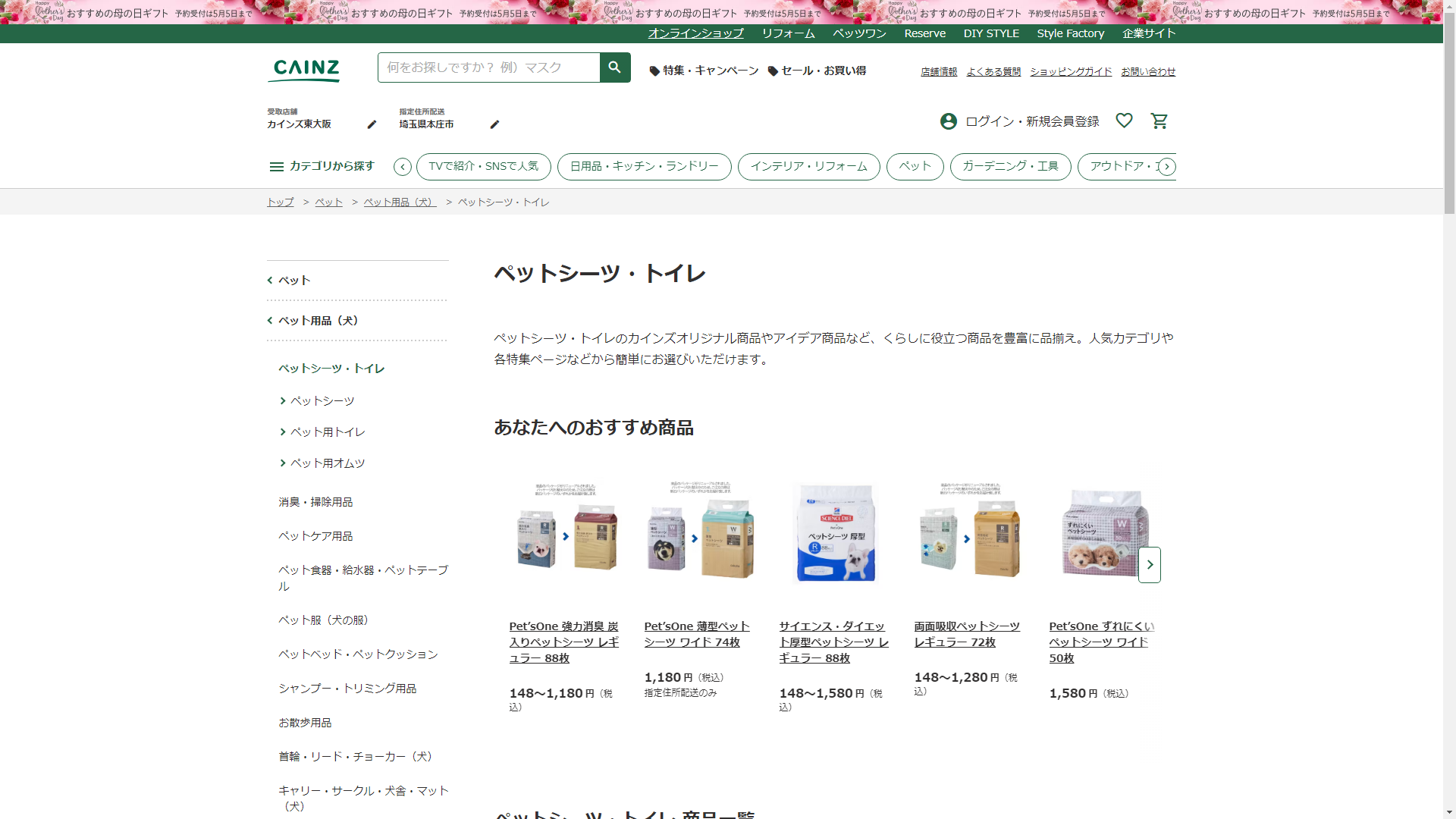 ペットシーツはCAINZに売っています