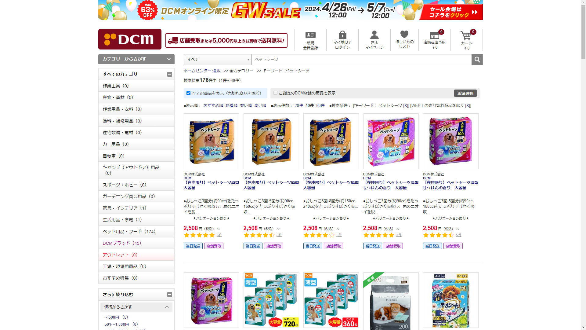 お調べしたところ現在、DCMではペットシーツに関連する商品が販売されています。