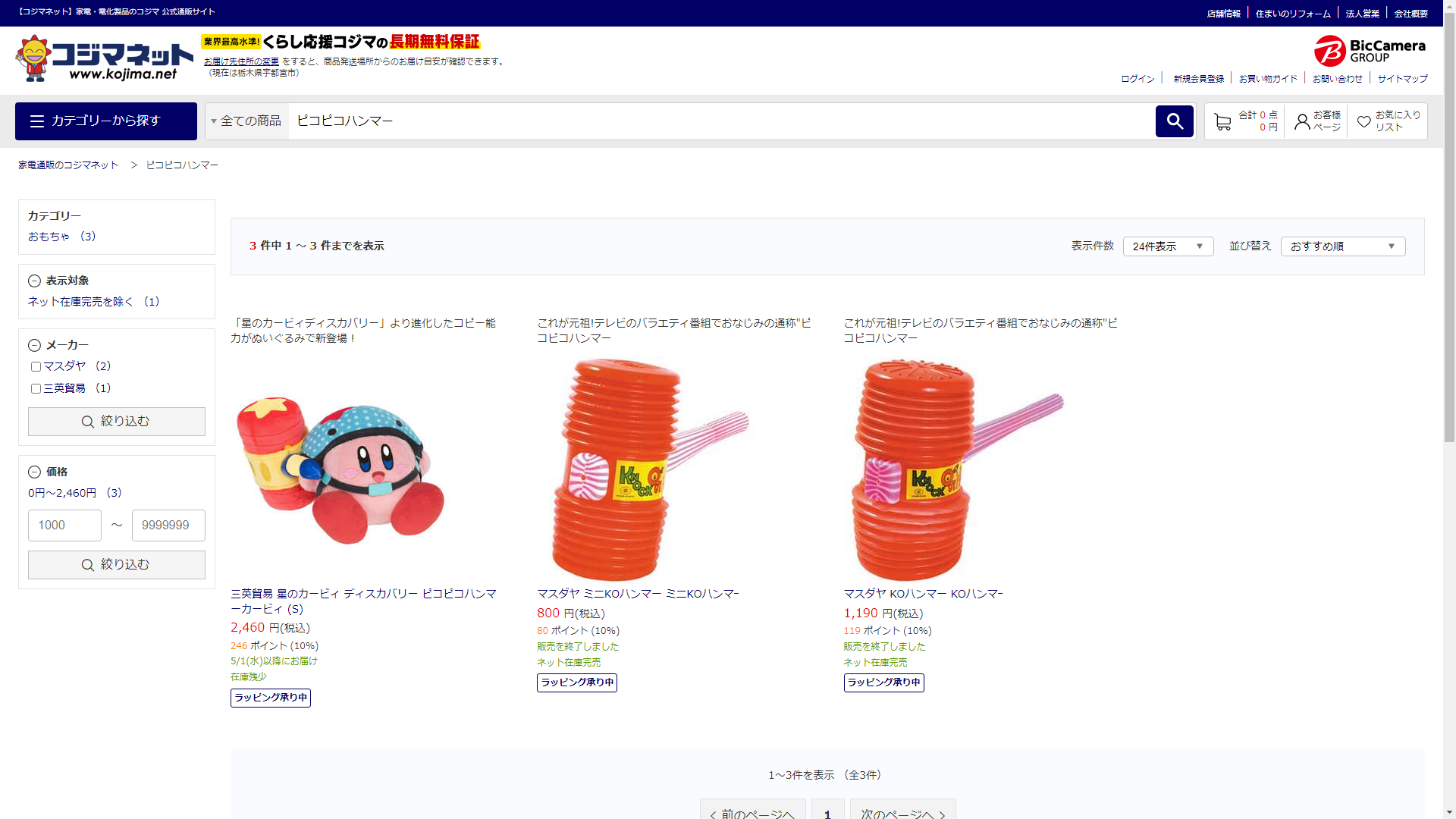 お調べしたところ現在、家電・電化製品のコジマではピコピコハンマーに関連する商品が販売されています。