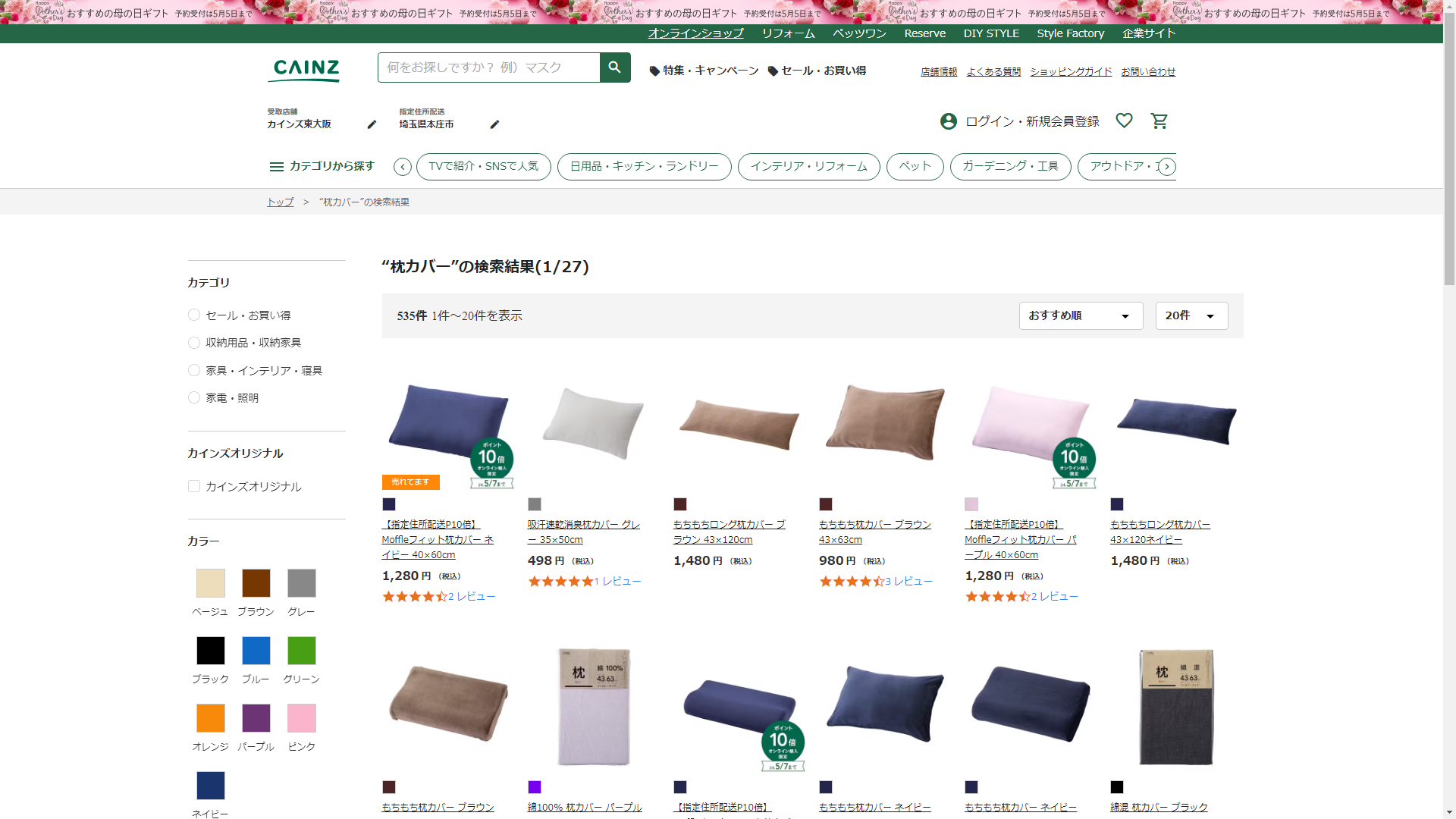 枕カバーはCAINZに売っています