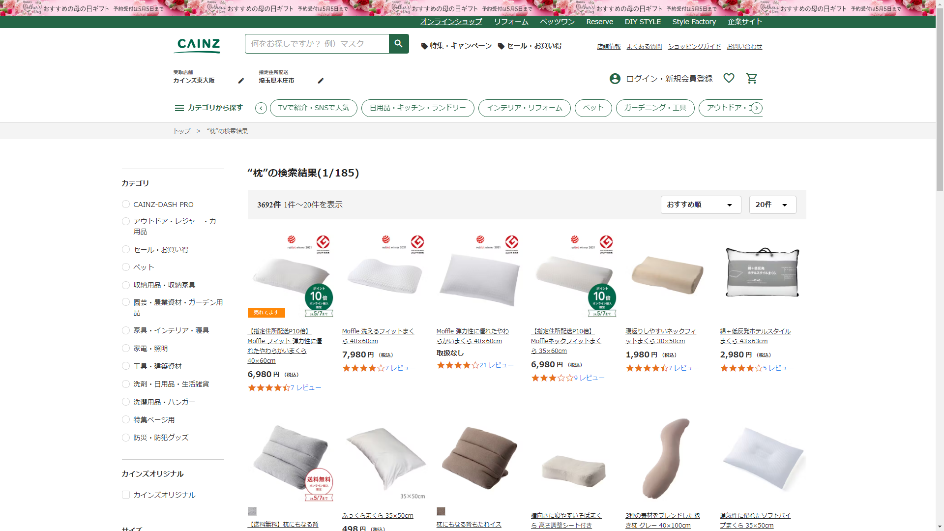 枕はCAINZに売っています