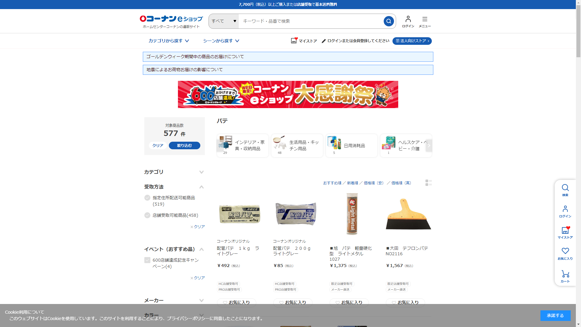 お調べしたところ現在、ホームセンターコーナンではパテに関連する商品を買うことが可能です。