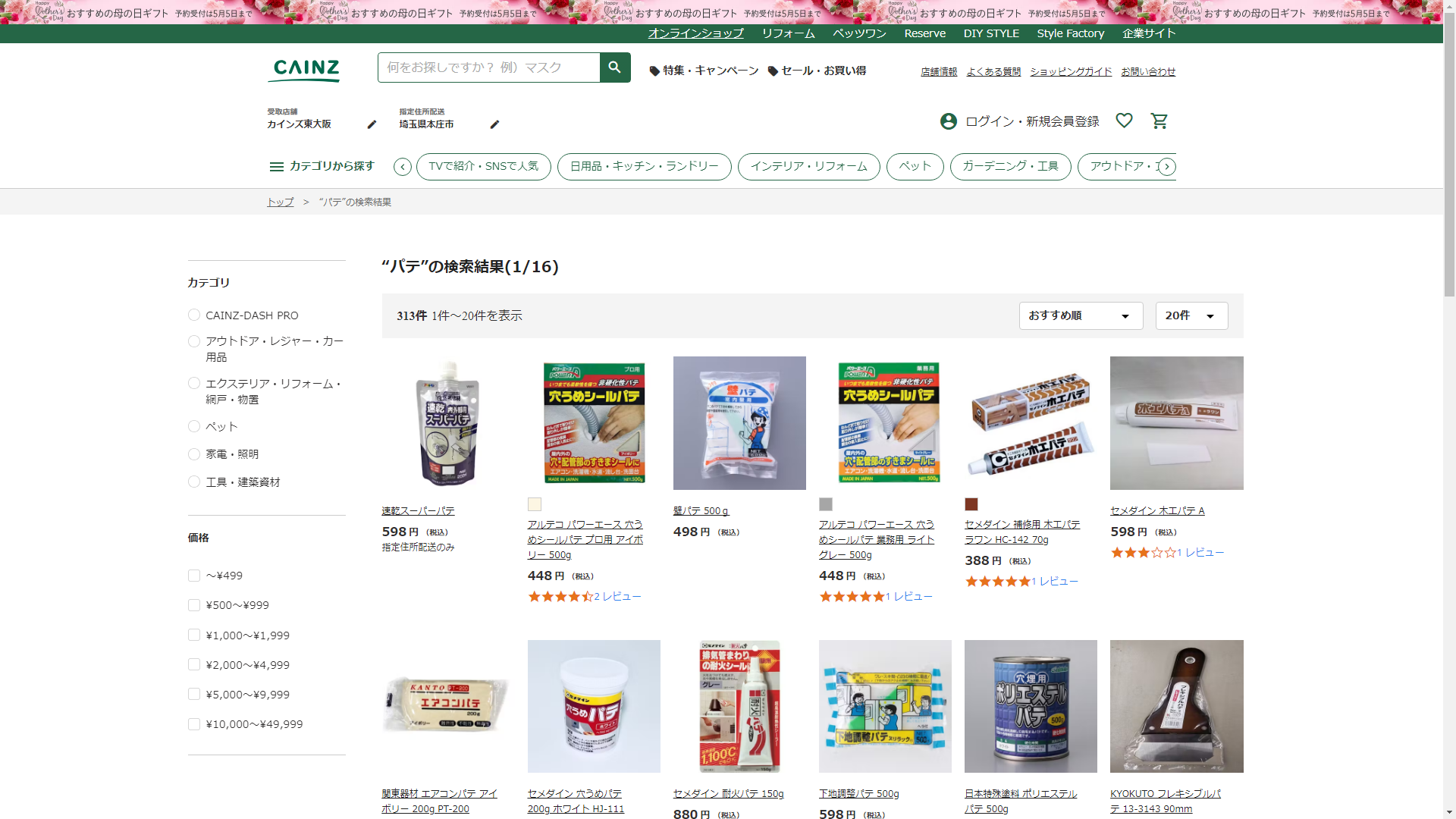 お調べしたところ現在、CAINZではパテの関連する商品が販売されています。