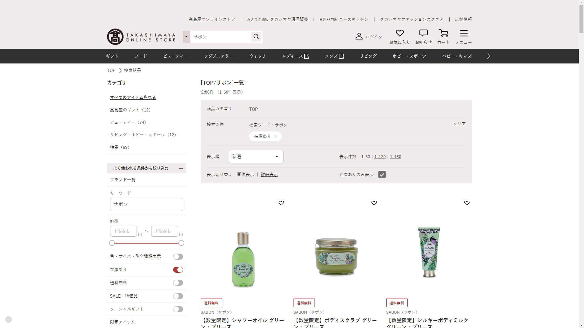 お調べしたところ現在、高島屋ではサボンの関連する商品が販売されています。
