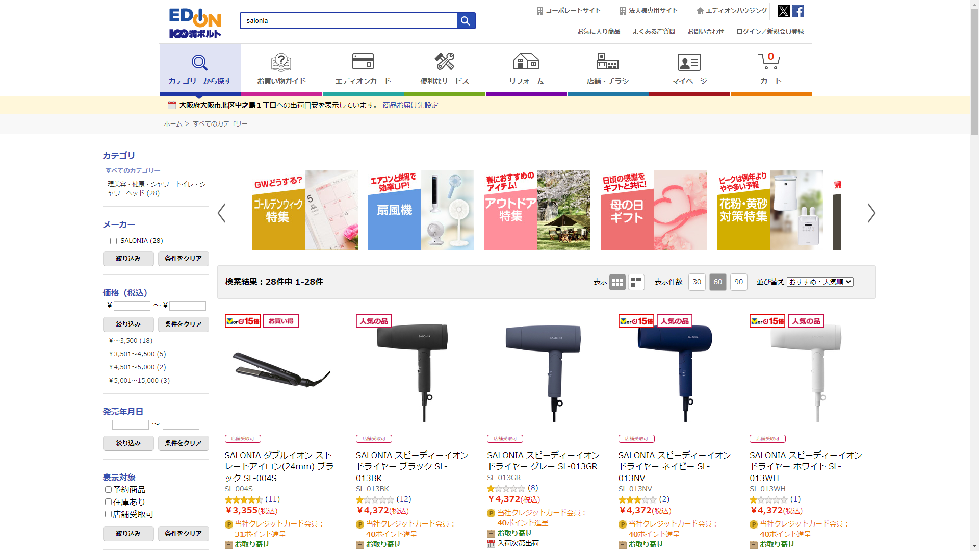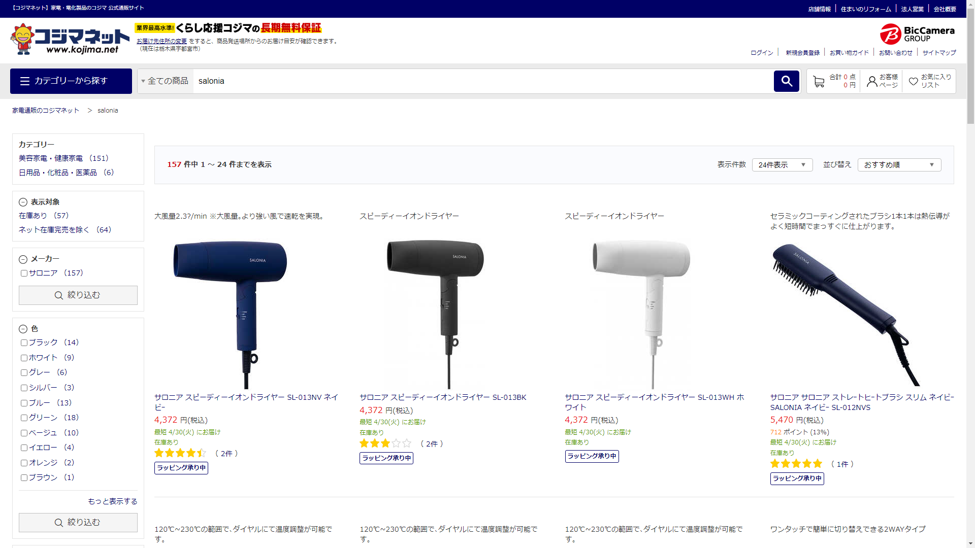 お調べしたところ現在、家電・電化製品のコジマではsaloniaの関連する商品が販売されています。