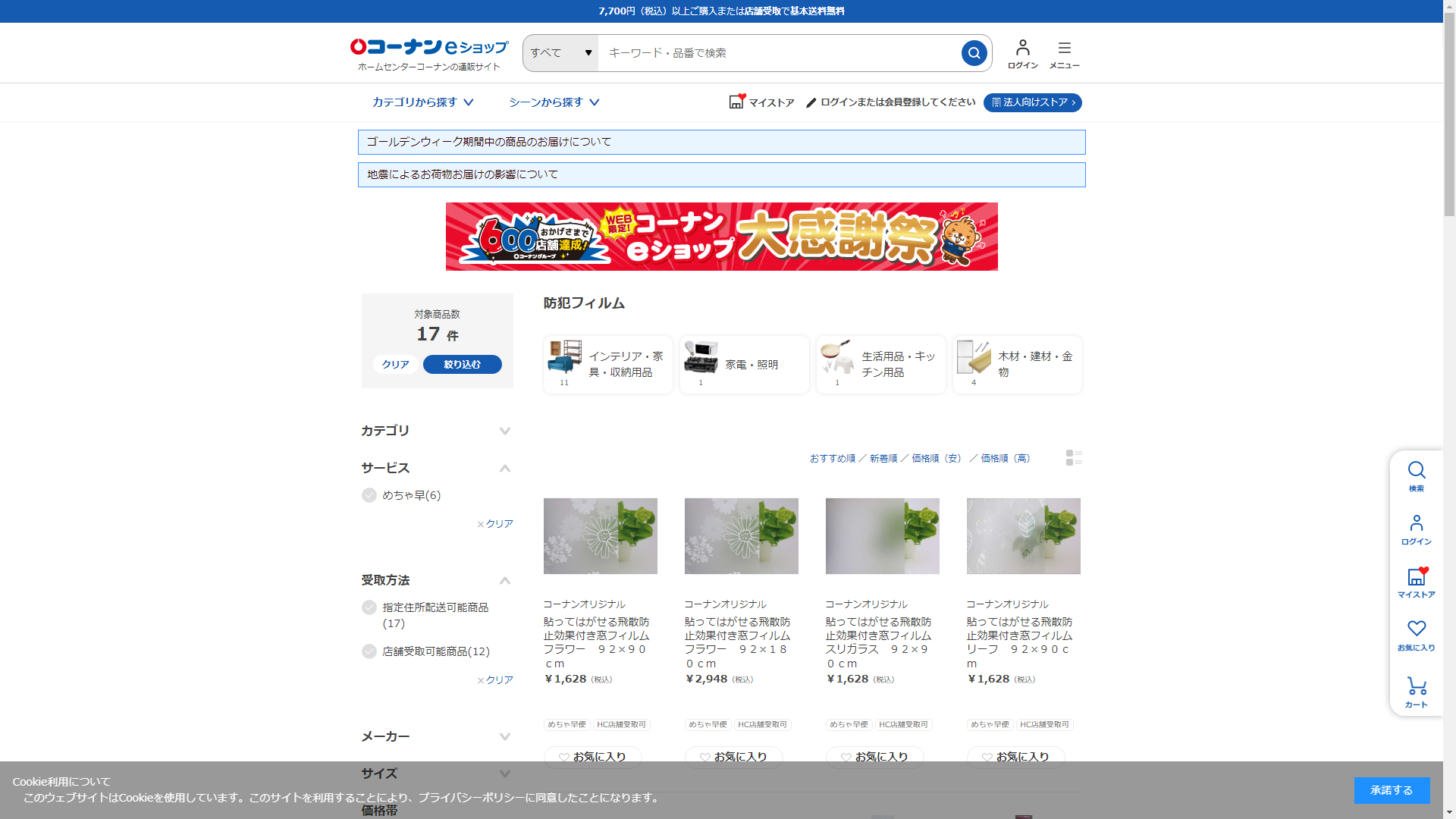 お調べしたところ現在、ホームセンターコーナンでは防犯フィルムに関連する商品を買うことが可能です。