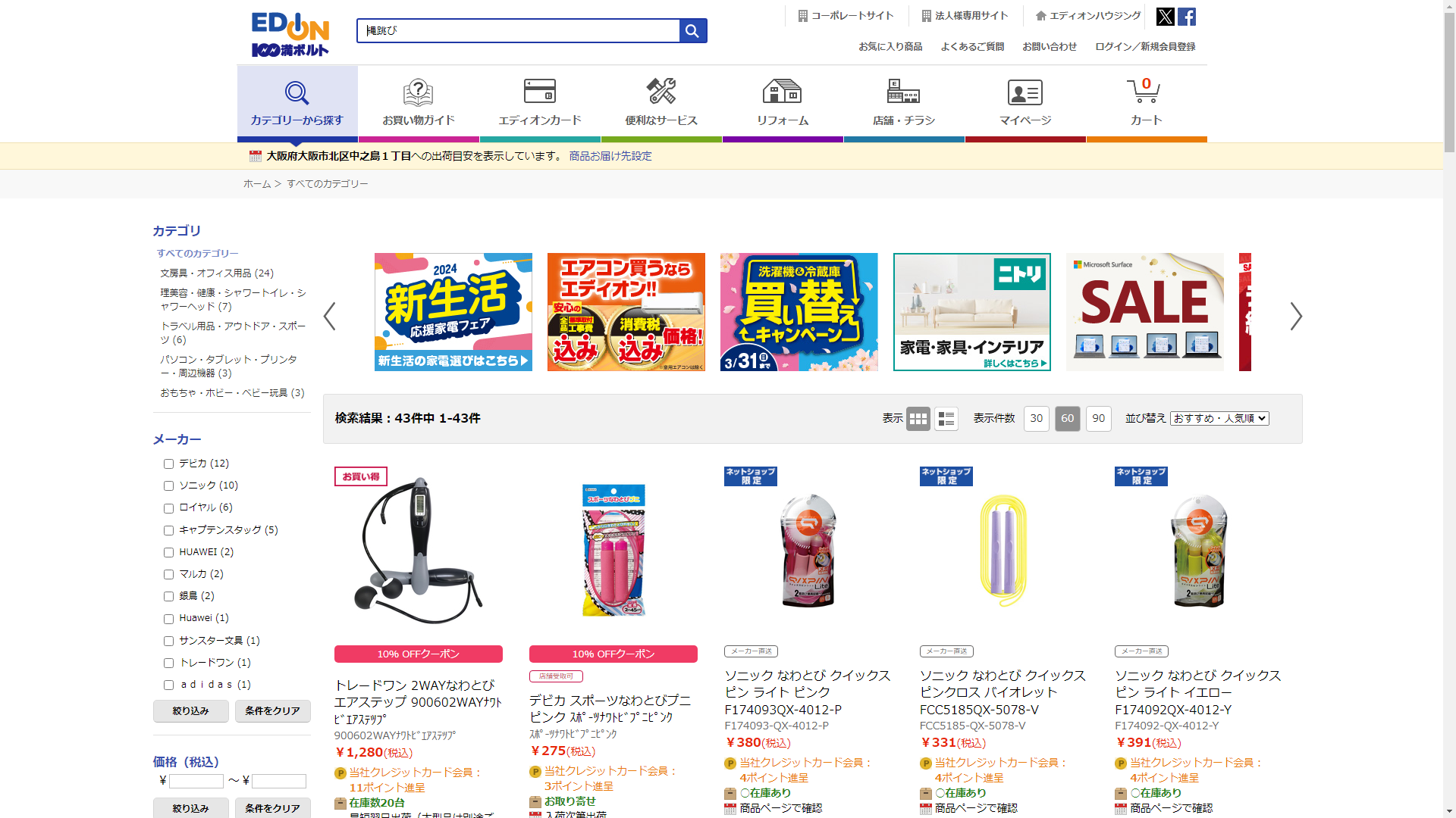 縄跳びは家電・電化製品のコジマで販売されています