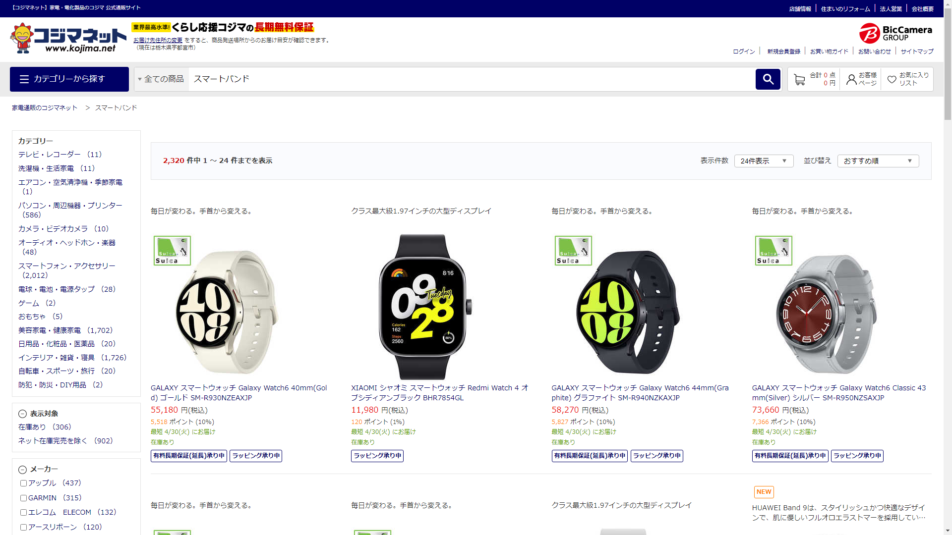 お調べしたところ現在、家電・電化製品のコジマではスマートバンドの関連する商品が販売されています。