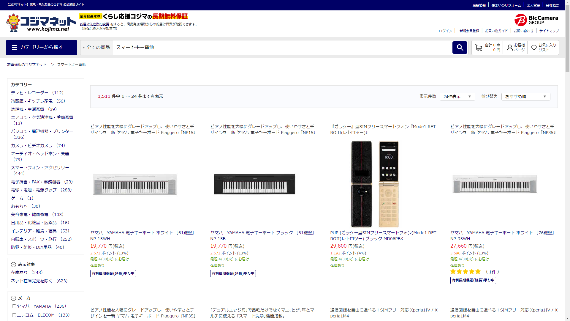 お調べしたところ現在、家電・電化製品のコジマではスマートキー電池の関連する商品が販売されています。