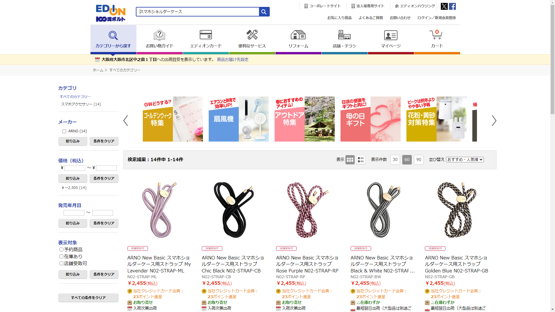 お調べしたところ現在、EDIONではスマホショルダーケースに関連する商品が販売されています。