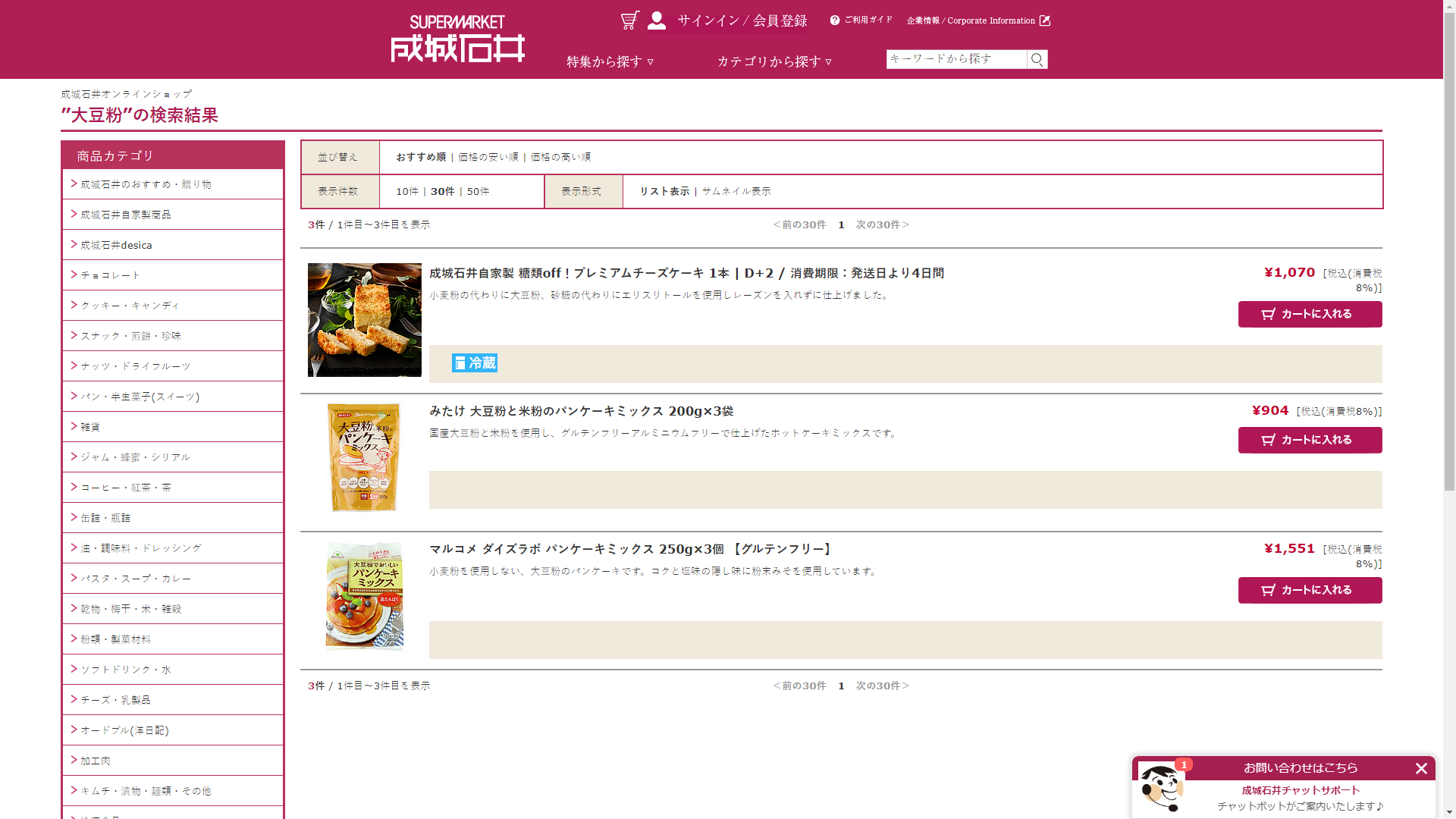 お調べしたところ現在、成城石井公式オンラインショップでは大豆粉に関連する商品を買うことが可能です。