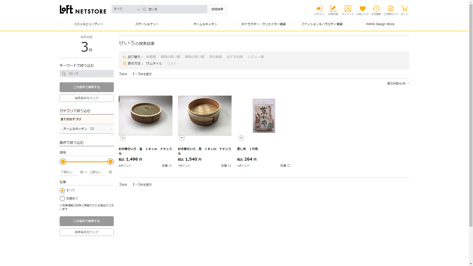 お調べしたところ現在、ロフトではせいろに関連する商品が販売されています。