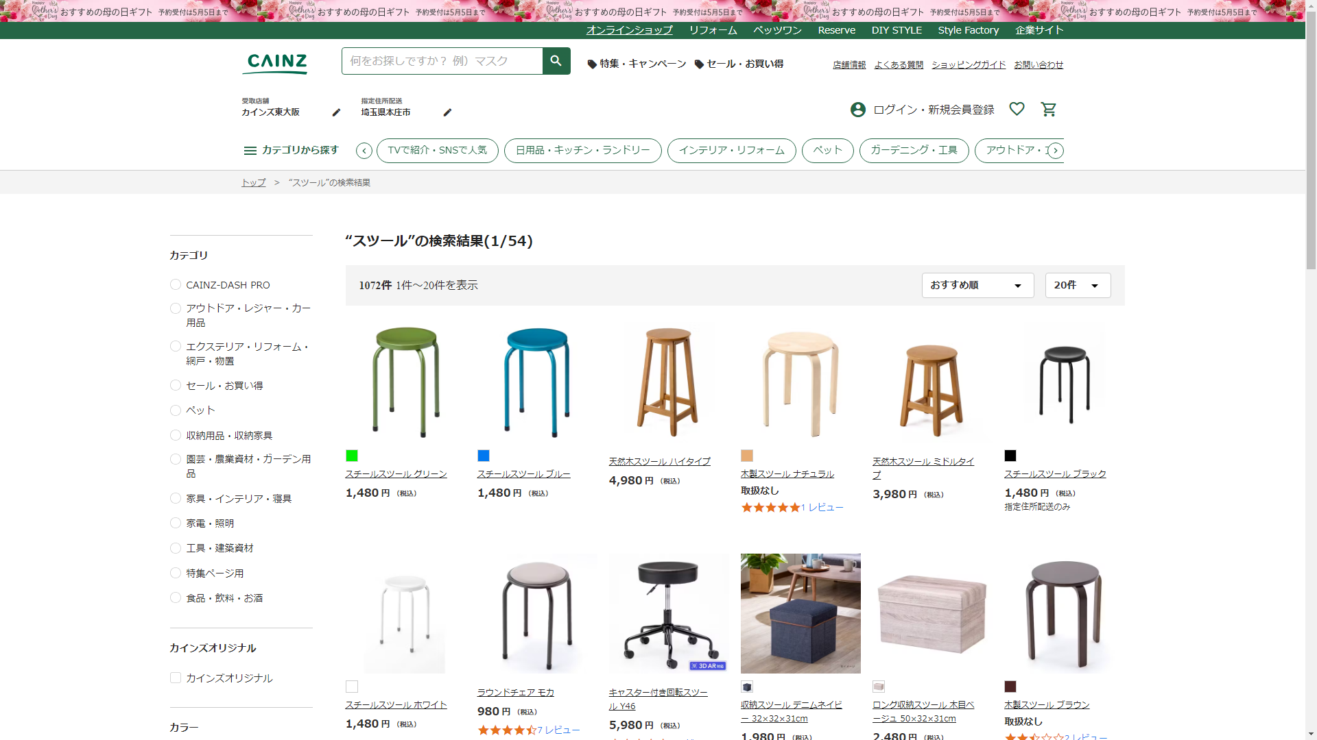 お調べしたところ現在、CAINZではスツールの関連する商品が販売されています。