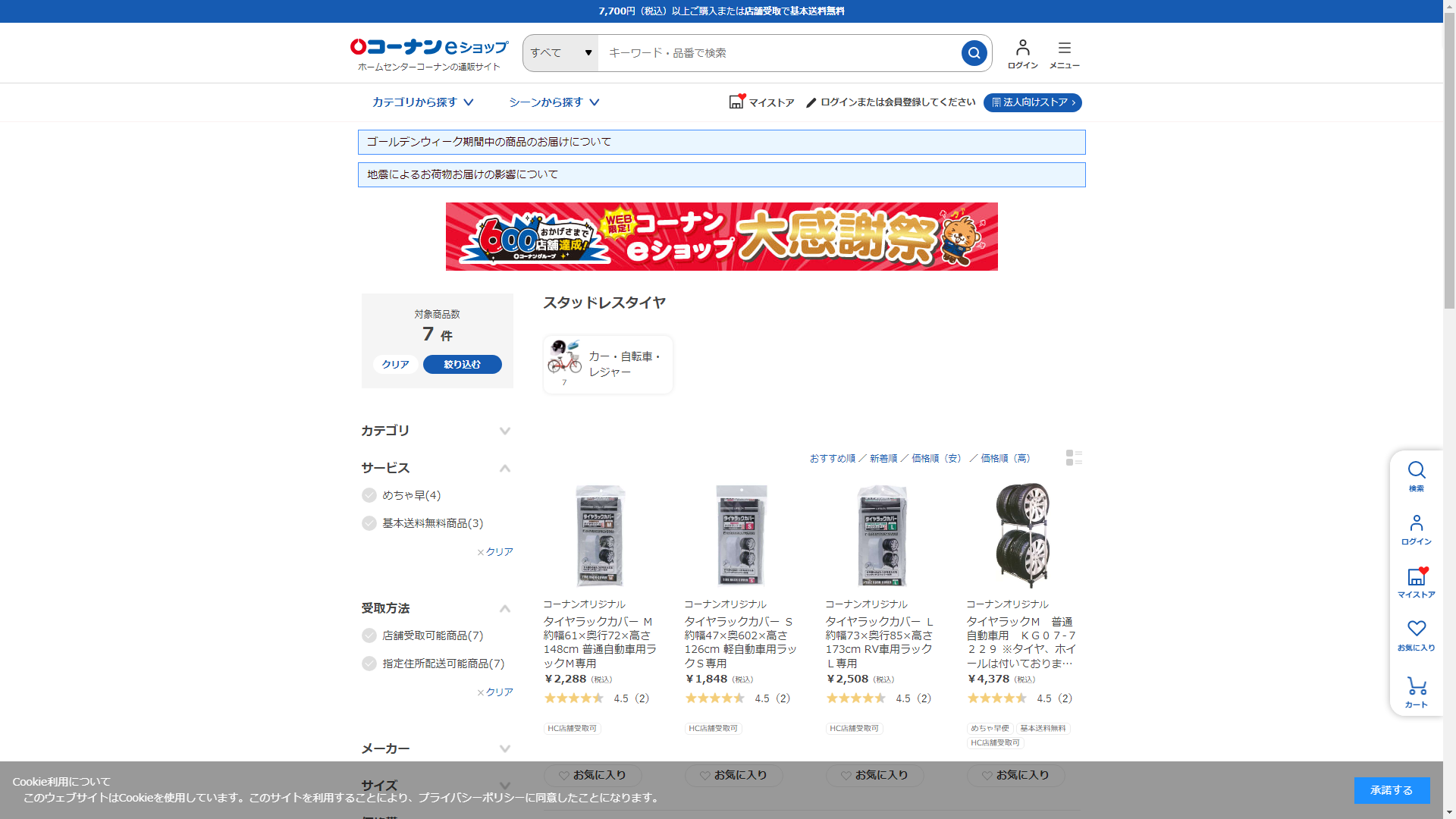 お調べしたところ現在、ホームセンターコーナンではスタッドレスタイヤに関連する商品を買うことが可能です。