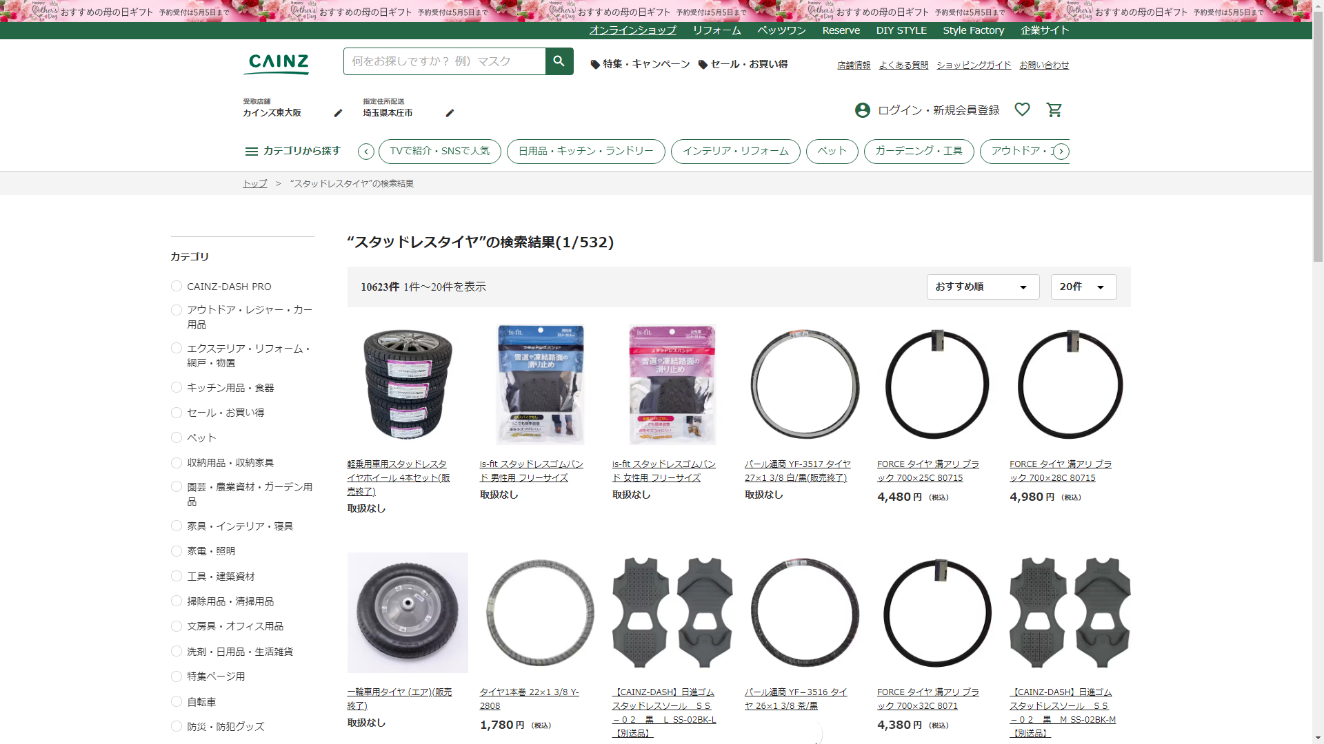 お調べしたところ現在、CAINZではスタッドレスタイヤの関連する商品が販売されています。