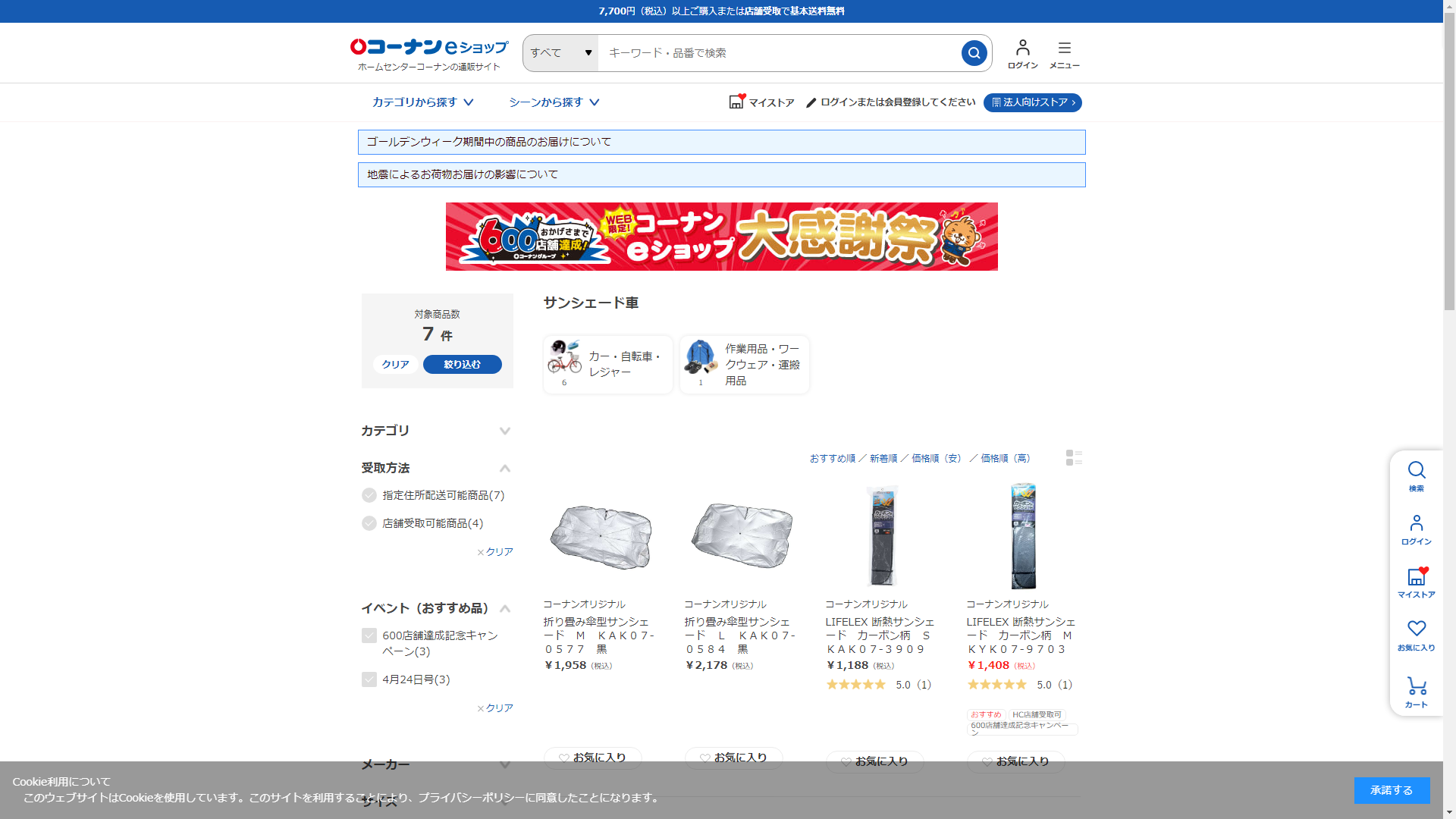 お調べしたところ現在、ホームセンターコーナンではサンシェード車に関連する商品を買うことが可能です。