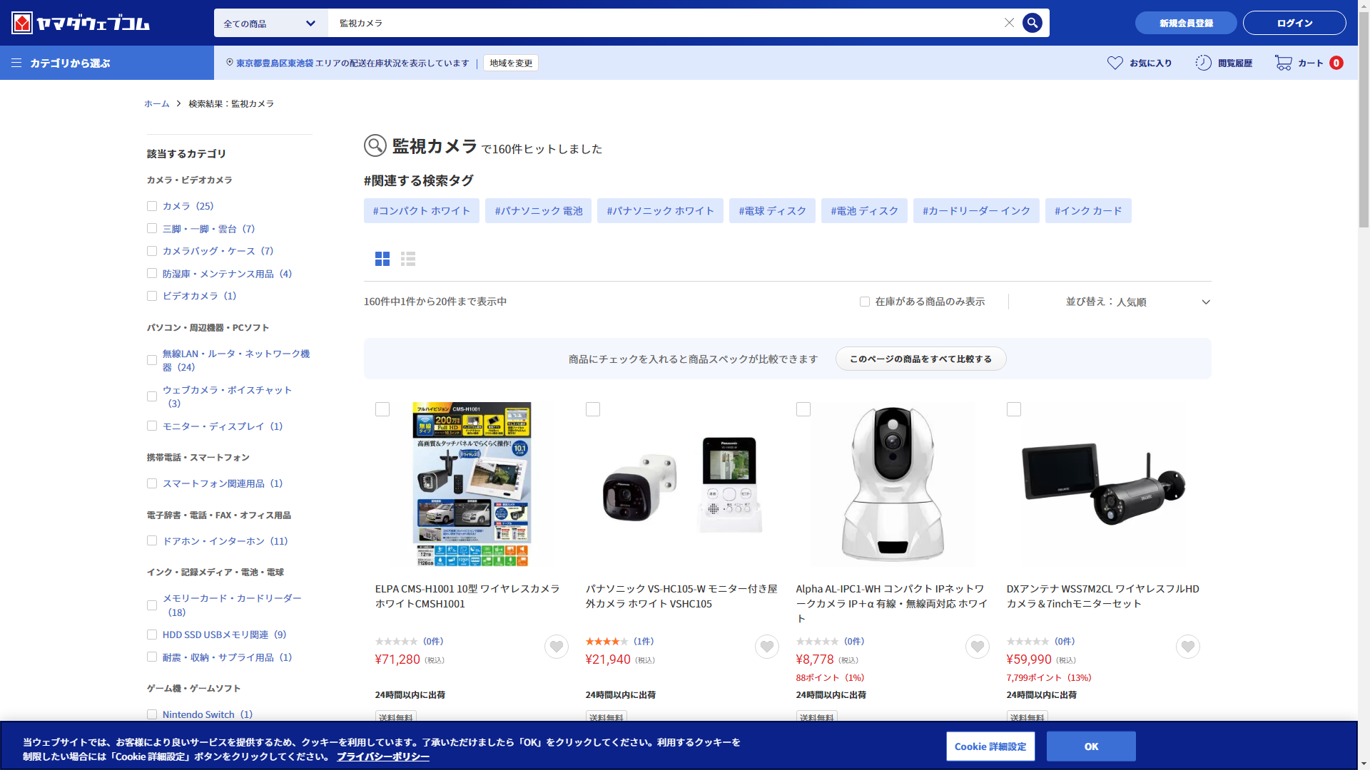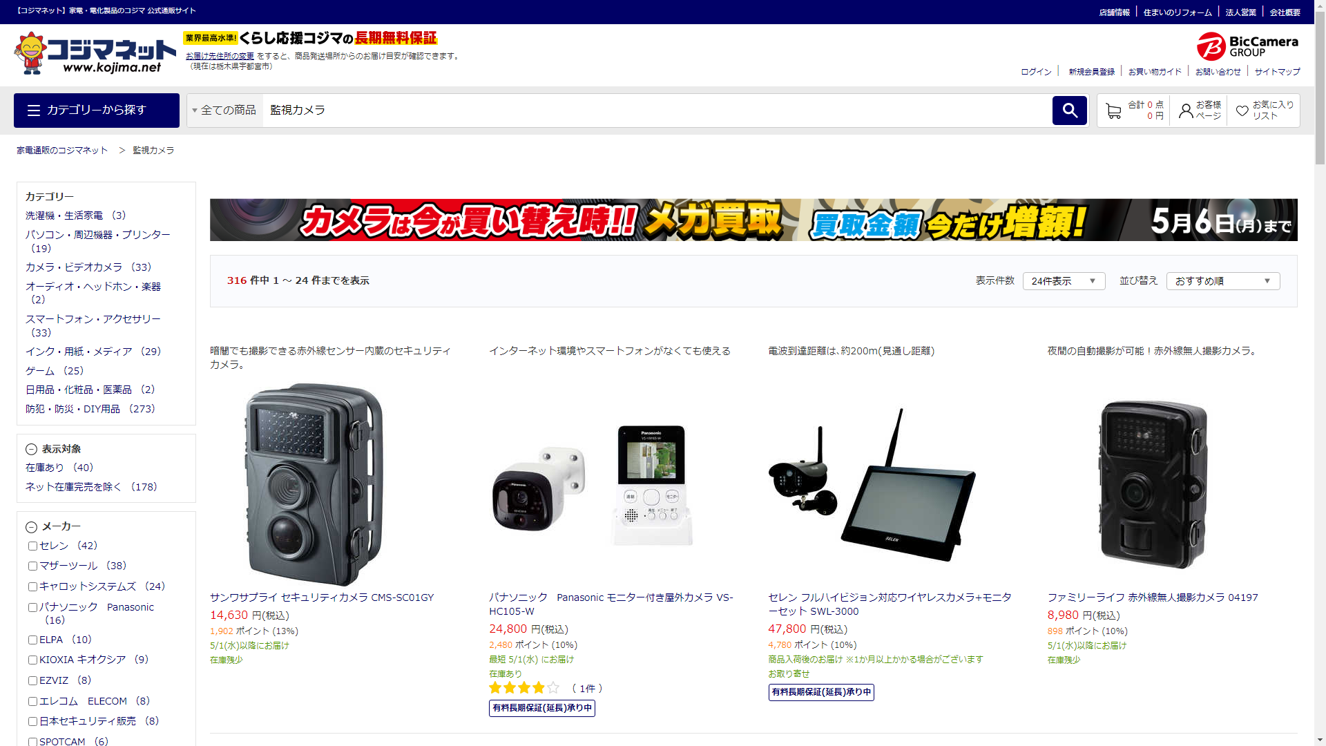 お調べしたところ現在、家電・電化製品のコジマでは監視カメラの関連する商品が販売されています。