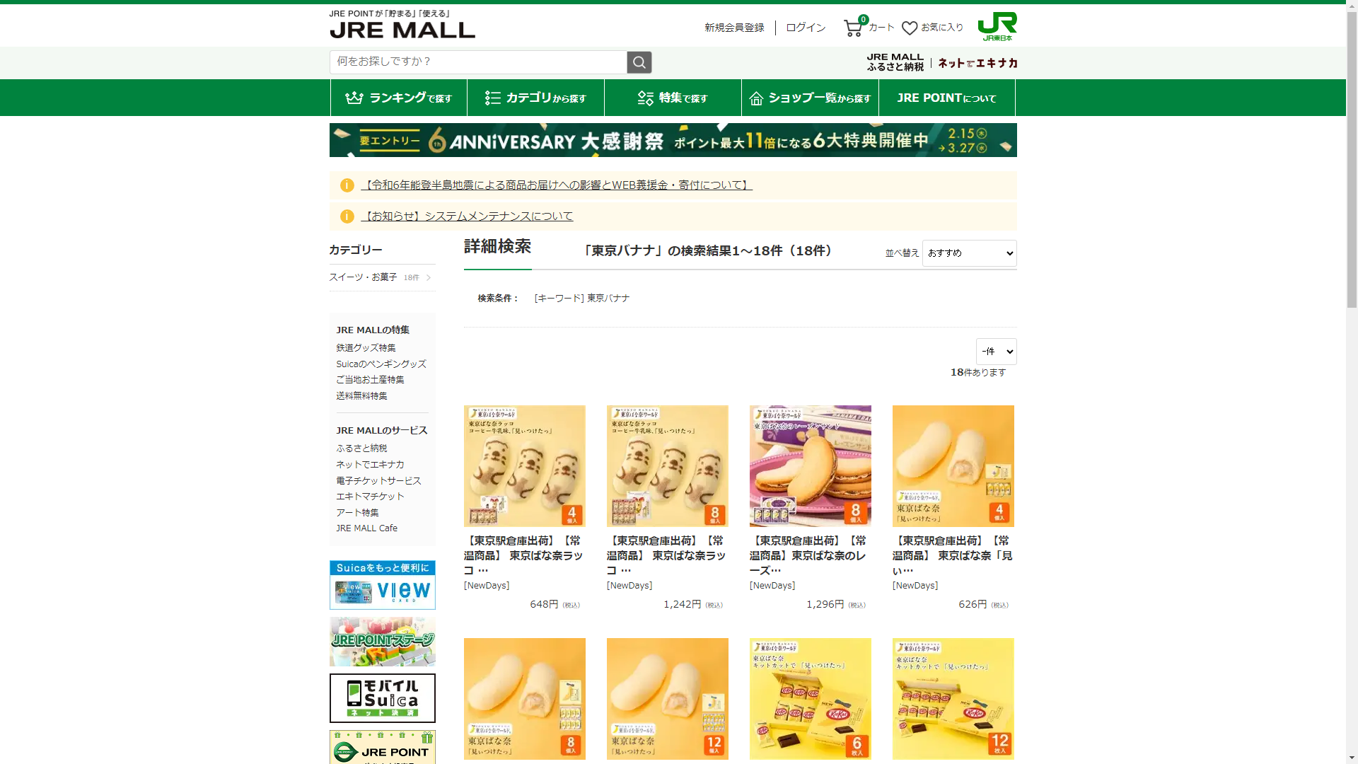 お調べしたところ現在、JRの駅お土産専門サイトJRE MALLでは東京バナナに関連する商品を買うことが可能です。