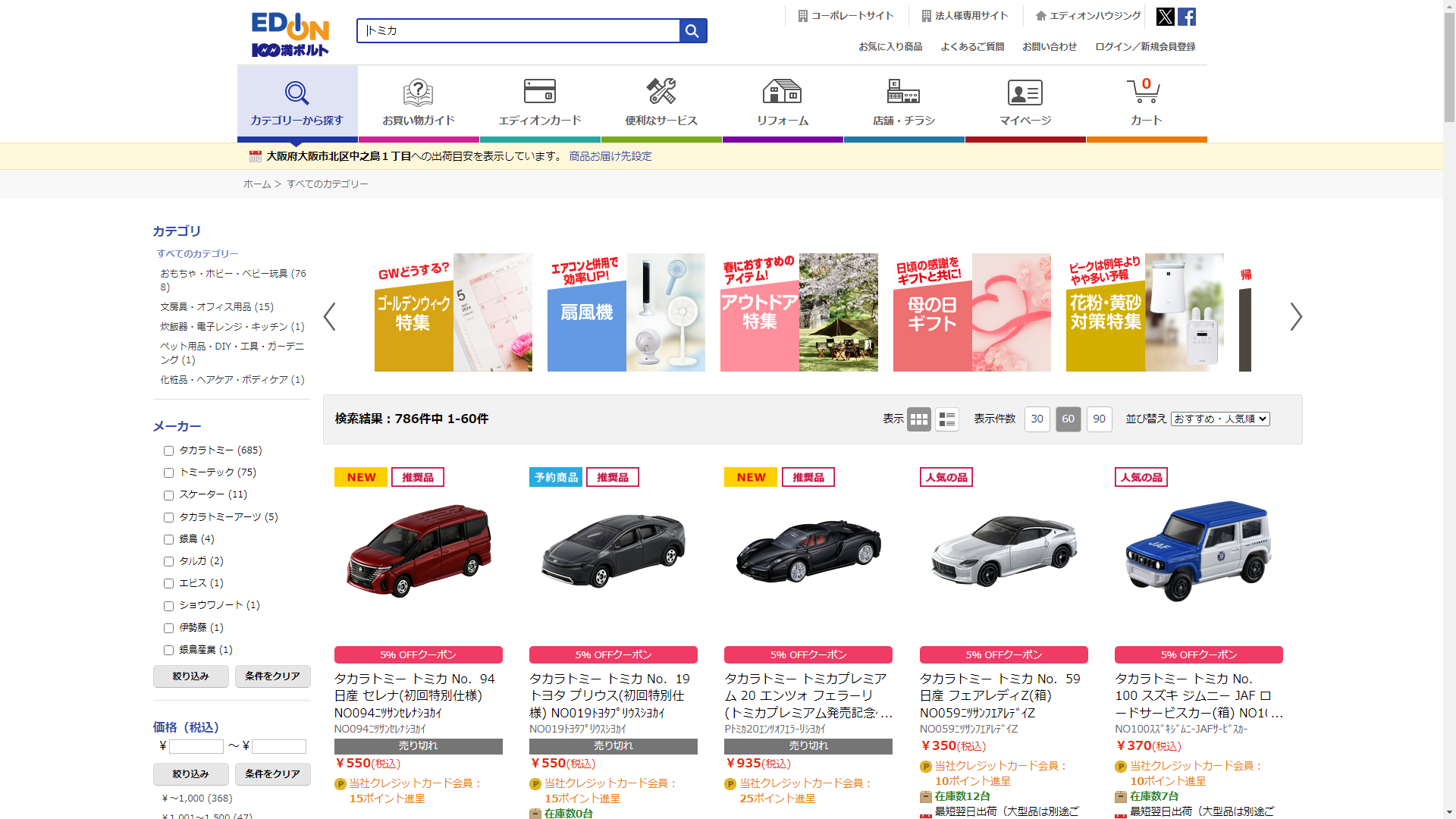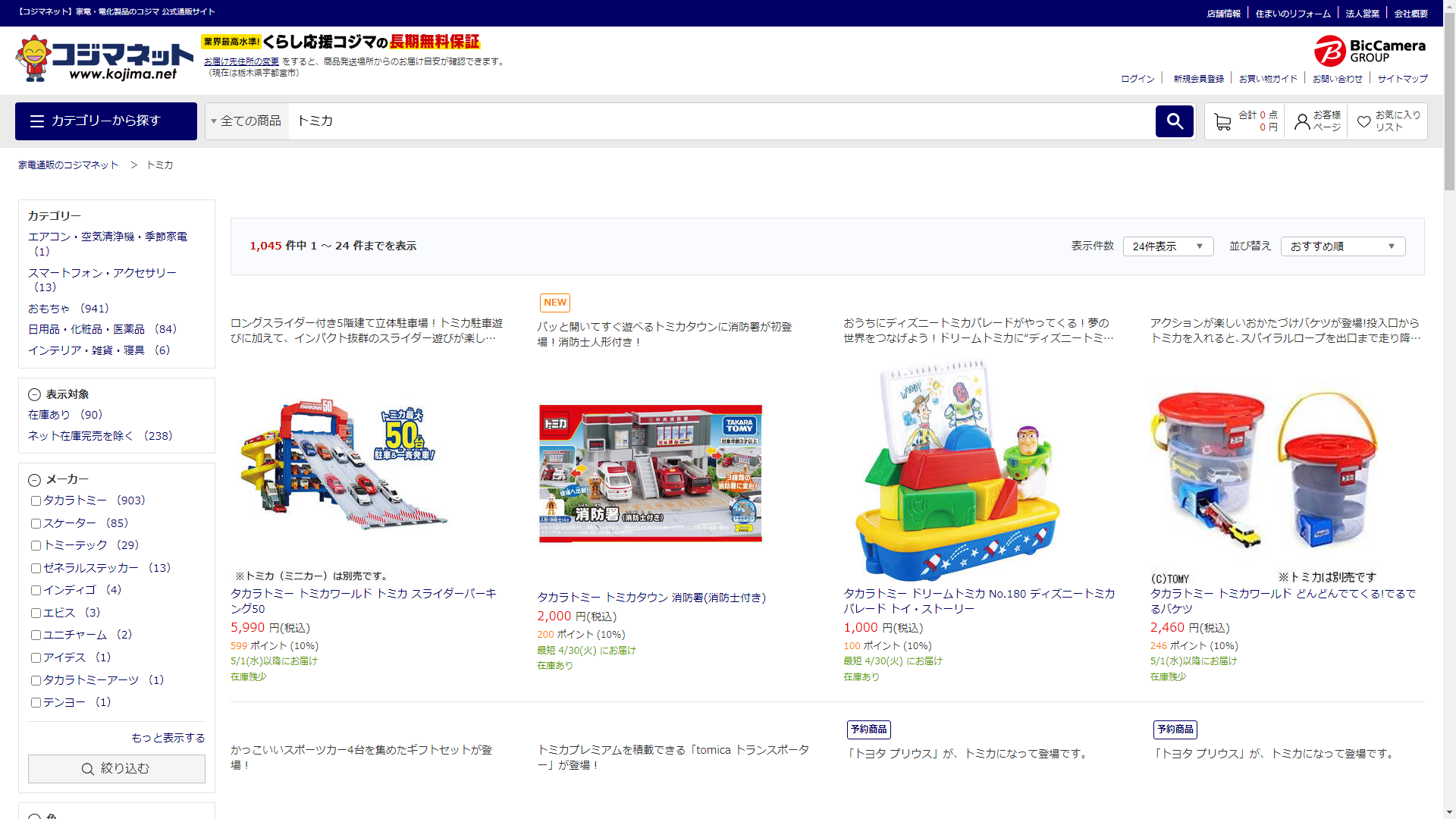 トミカは家電・電化製品のコジマで販売されています