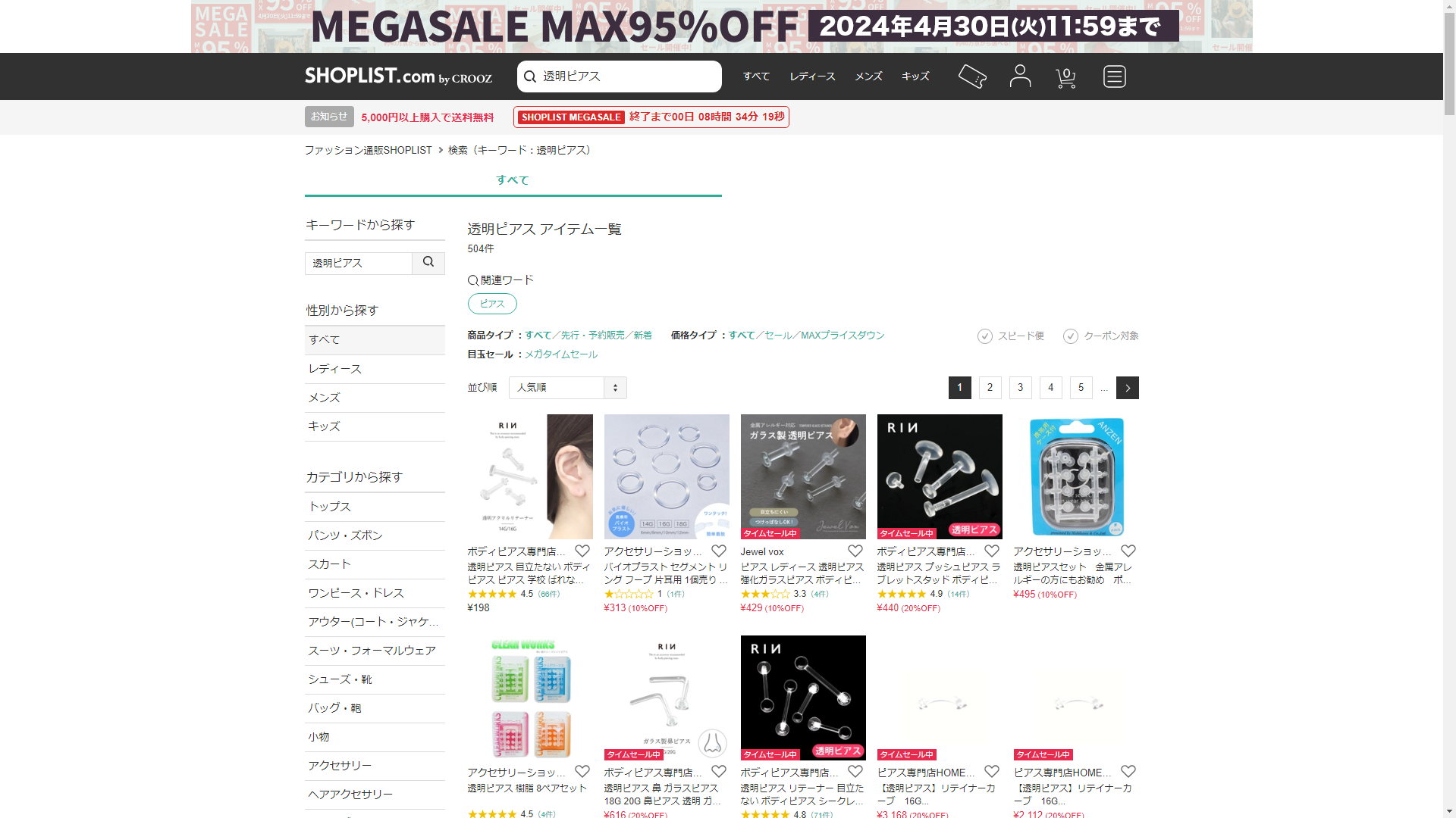 お調べしたところ現在、SHOPLISTでは透明ピアスの関連する商品が販売されています。
