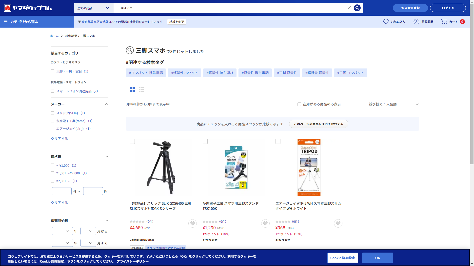 お調べしたところ現在、ヤマダデンキでは三脚スマホに関連する商品を買うことが可能です。