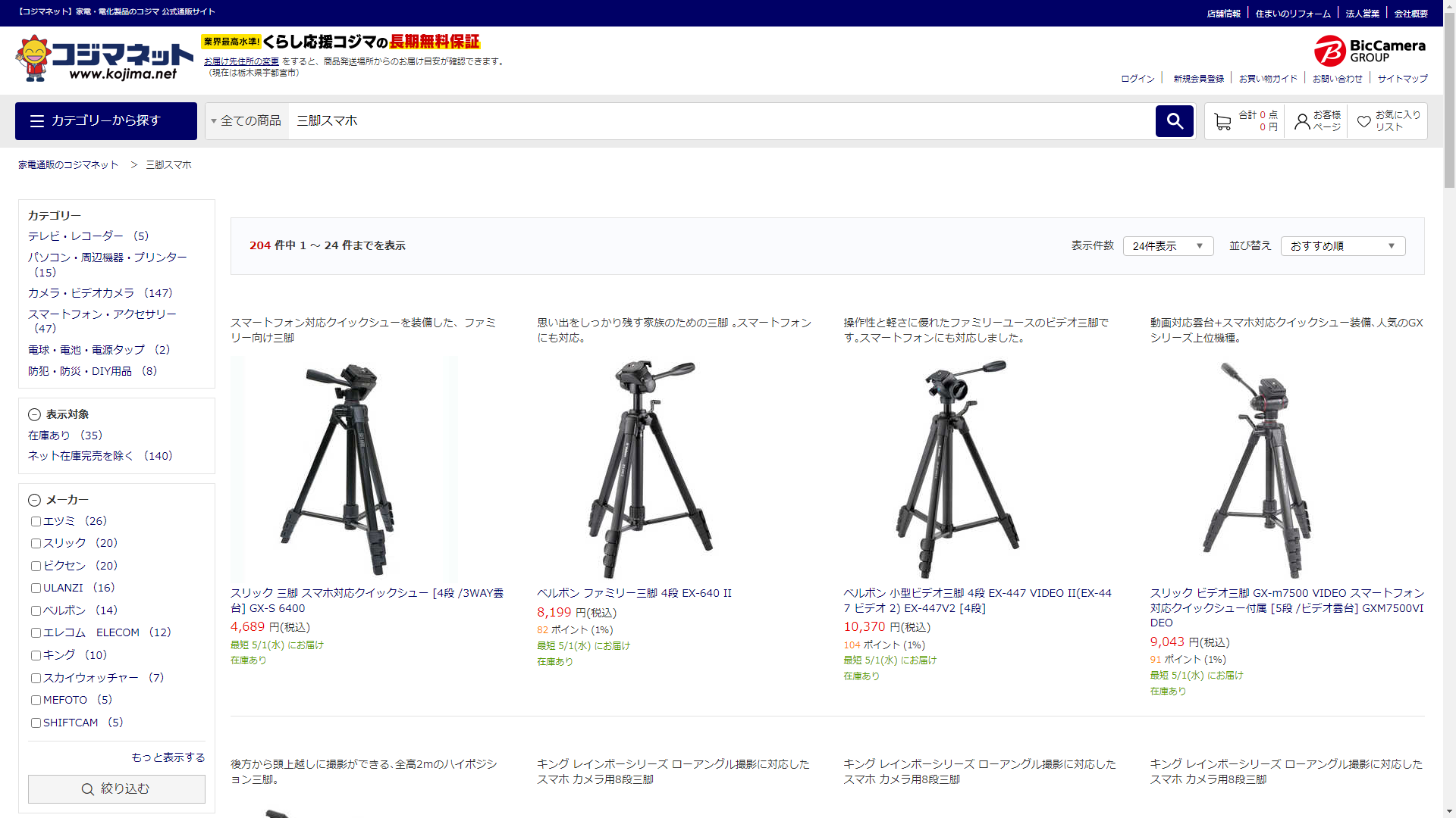 お調べしたところ現在、家電・電化製品のコジマでは三脚スマホの関連する商品が販売されています。