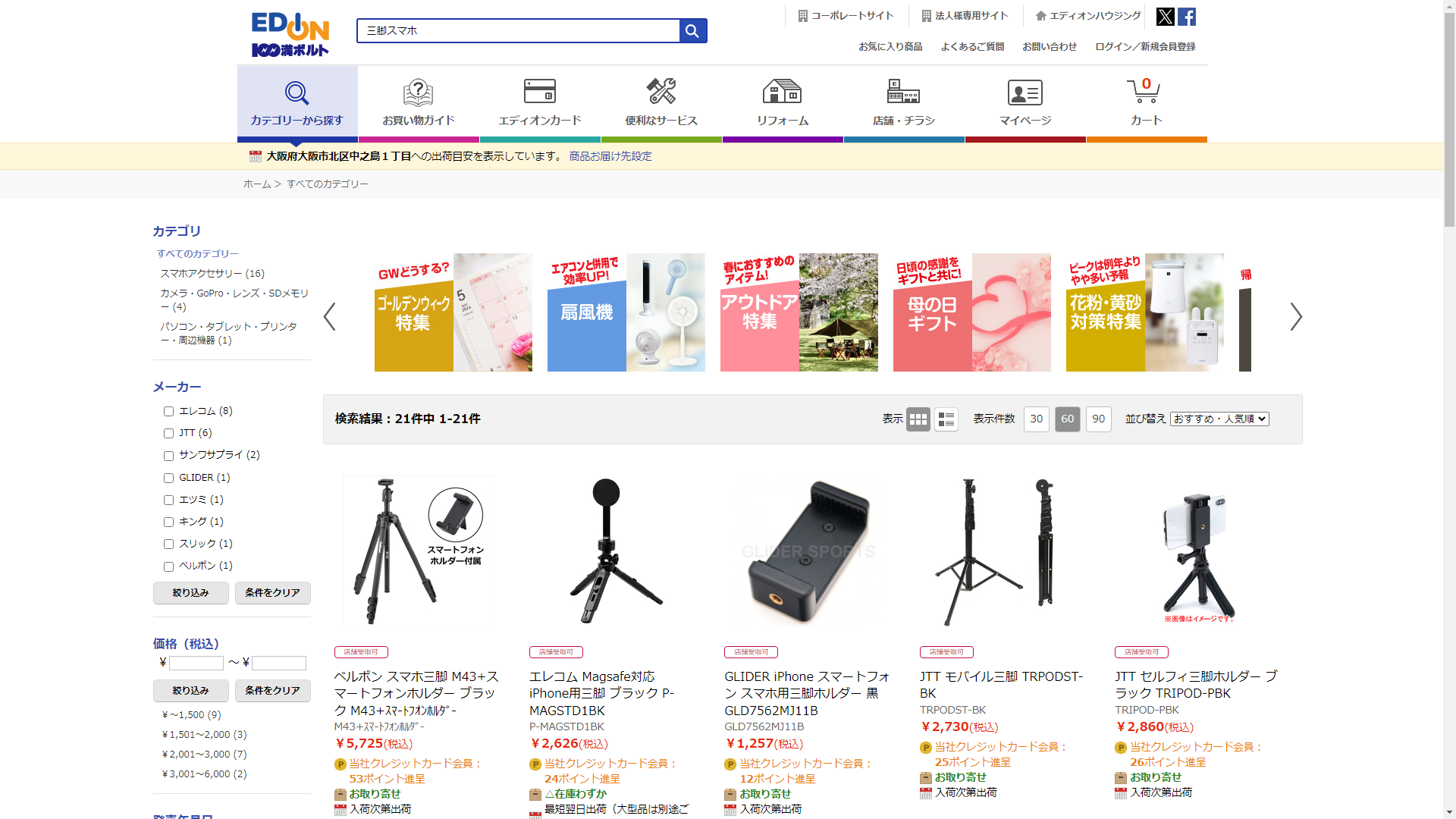 お調べしたところ現在、EDIONでは三脚スマホに関連する商品が販売されています。