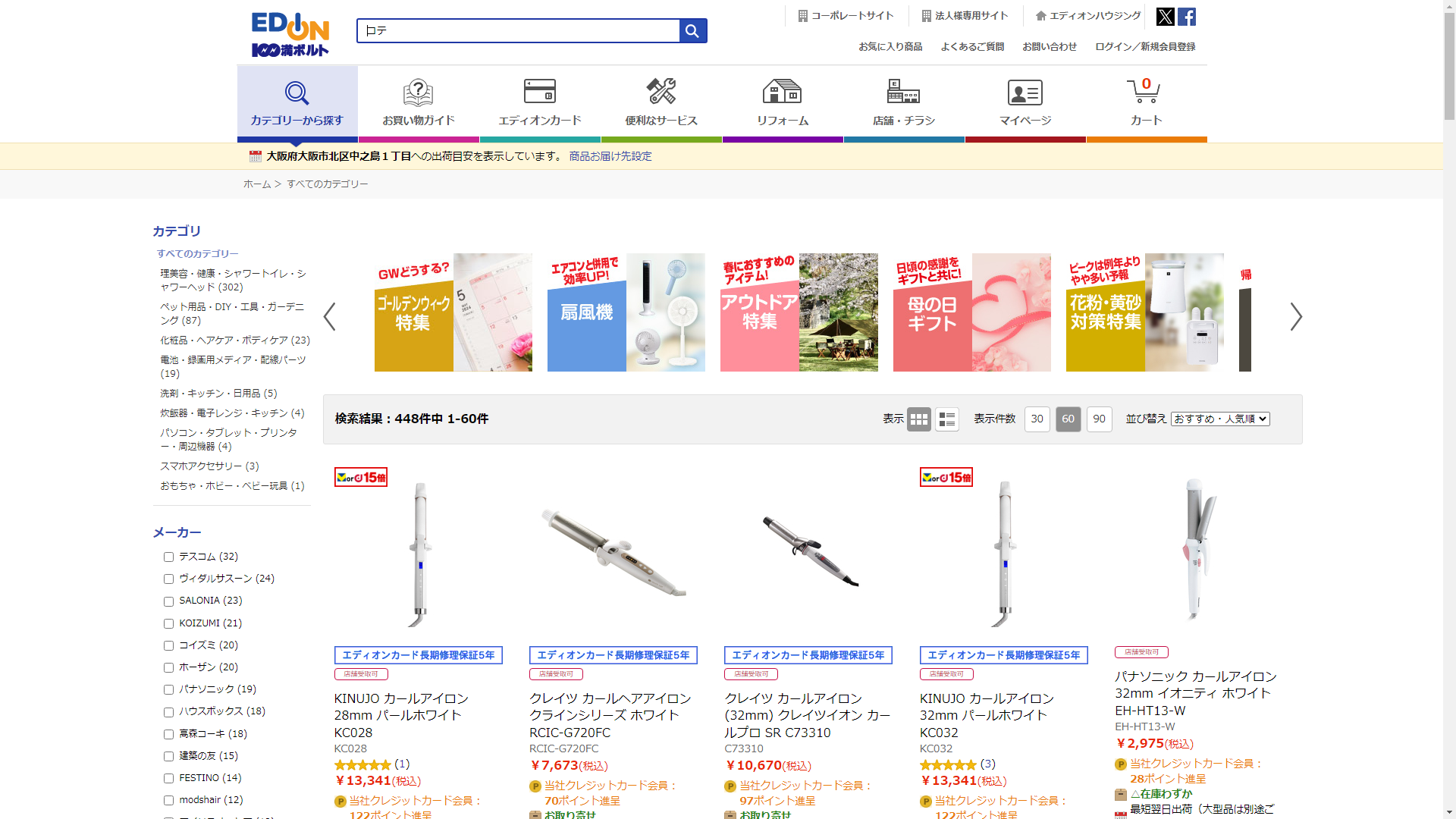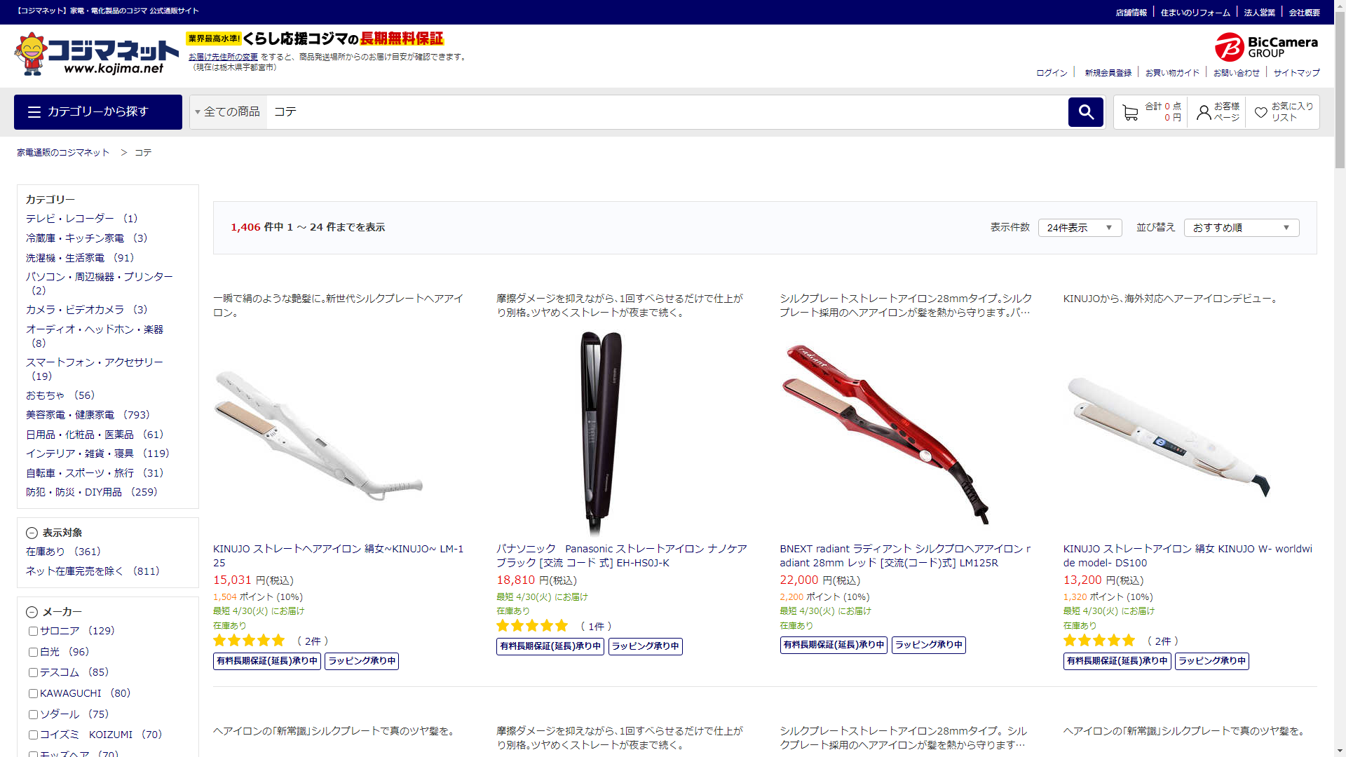 お調べしたところ現在、家電・電化製品のコジマではコテの関連する商品が販売されています。
