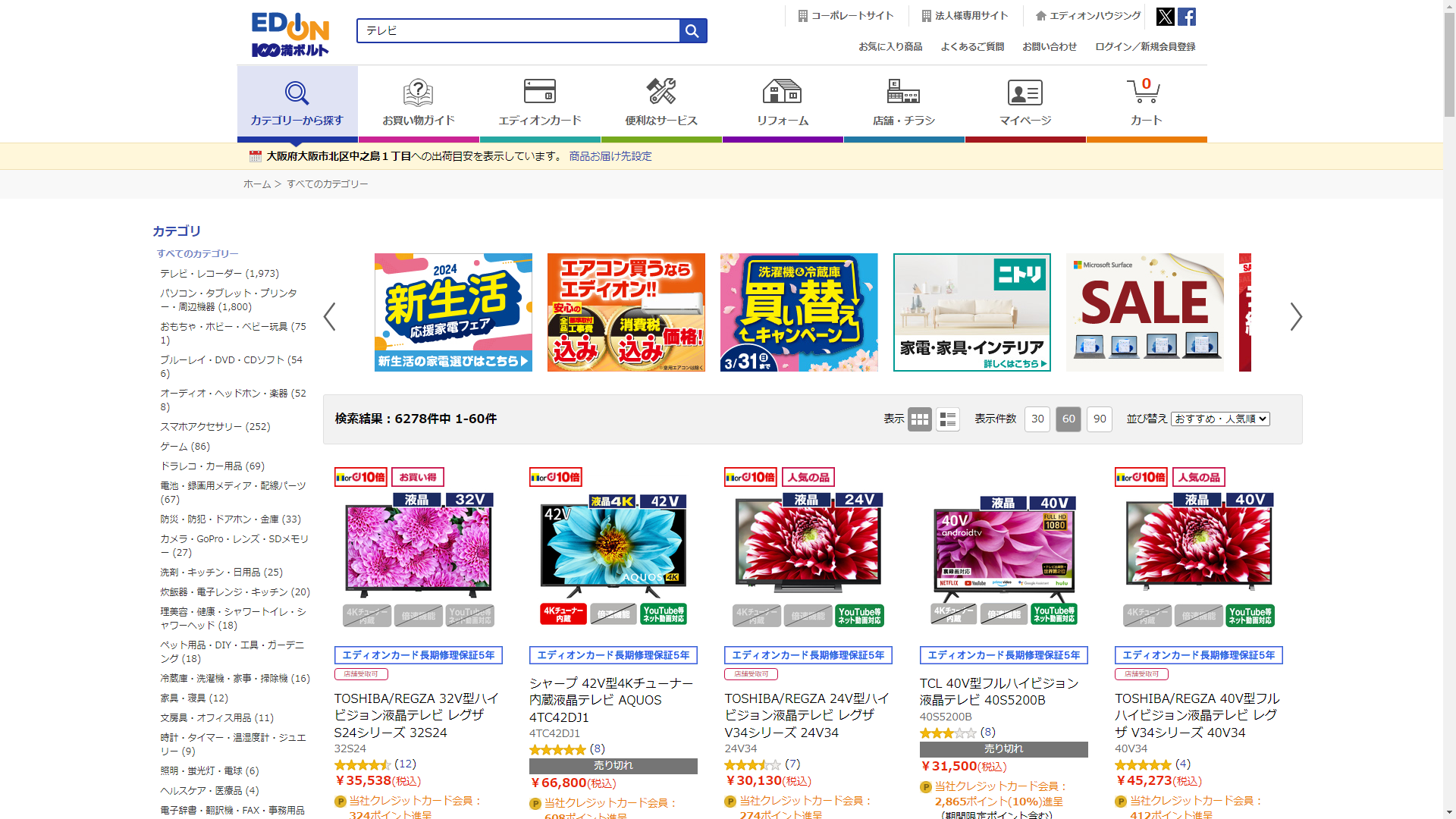 お調べしたところ現在、EDIONではテレビに関連する商品が販売されています。