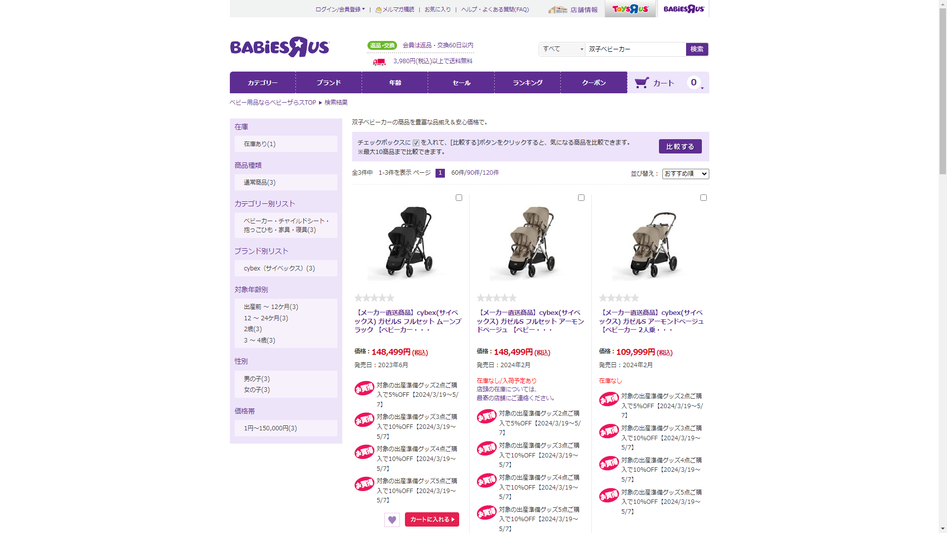 お調べしたところ現在、ベビーザらスでは双子ベビーカーに関連する商品を買うことが可能です。