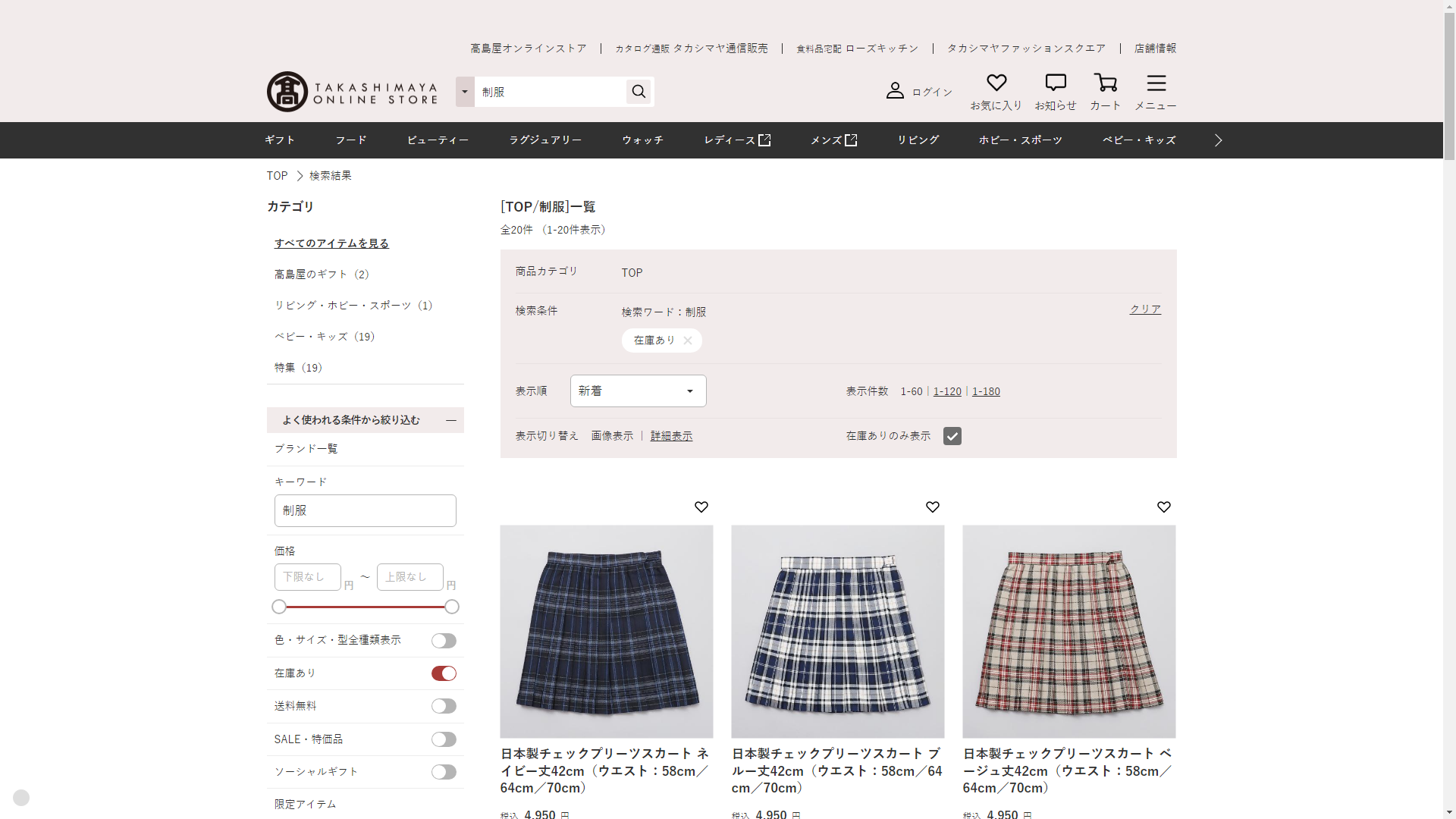 お調べしたところ現在、高島屋では制服に関連する商品が販売されています。