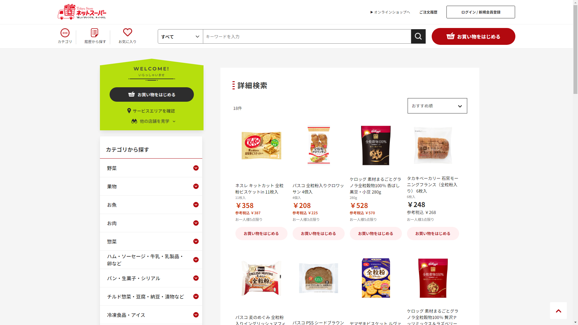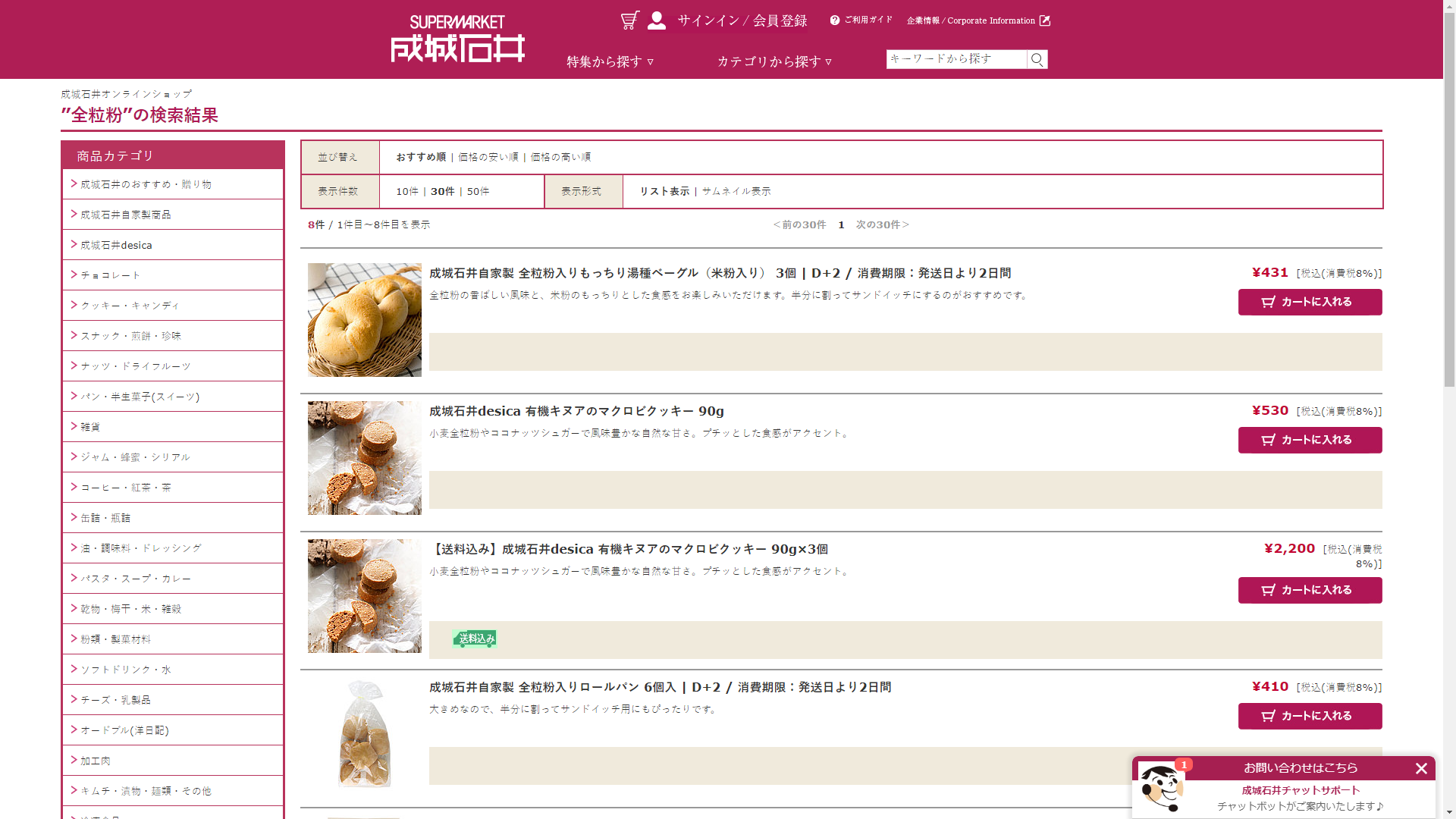 お調べしたところ現在、成城石井公式オンラインショップでは全粒粉に関連する商品を買うことが可能です。