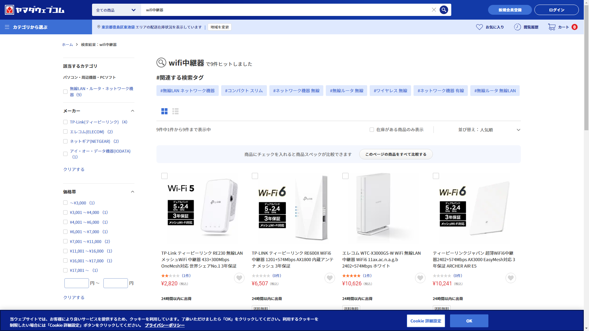 お調べしたところ現在、ヤマダデンキではwifi中継器に関連する商品を買うことが可能です。