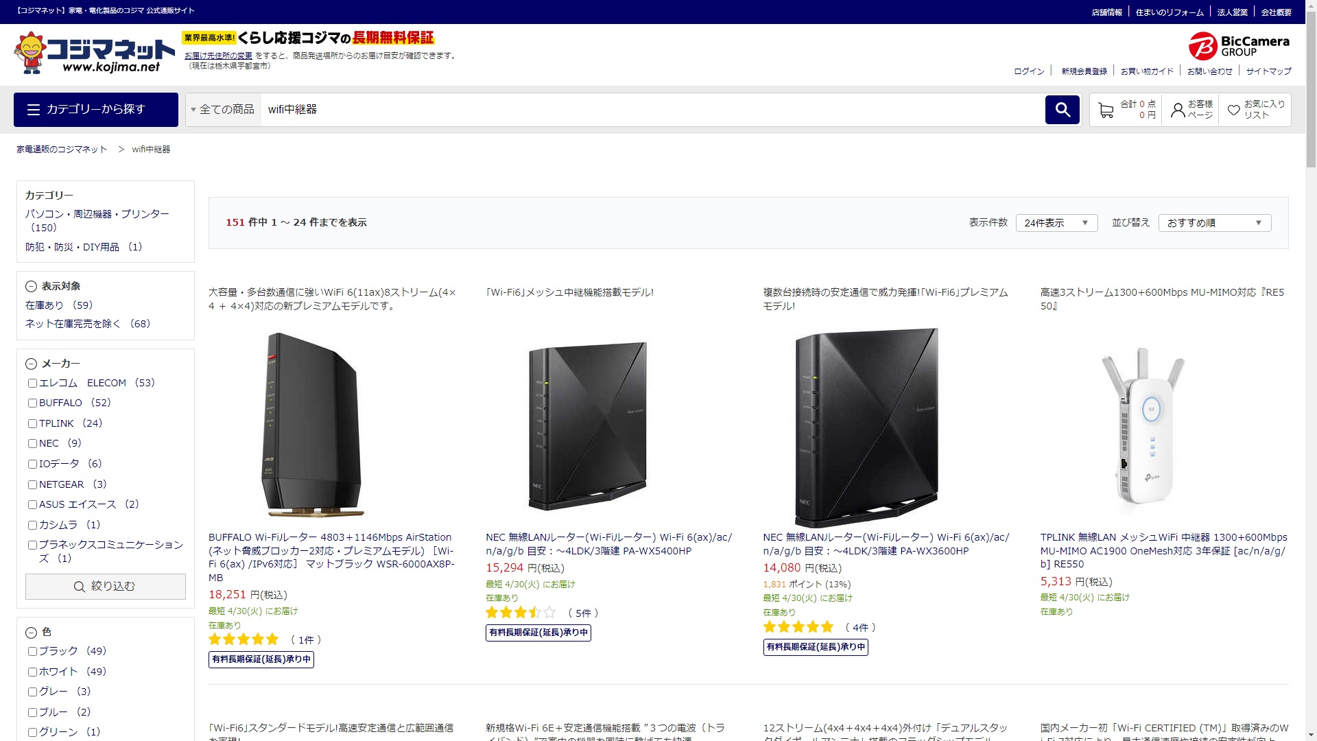 wifi中継器は家電・電化製品のコジマに売っています