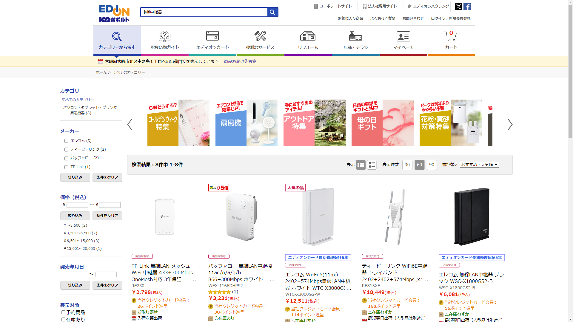 wifi中継器はEDIONで販売されています