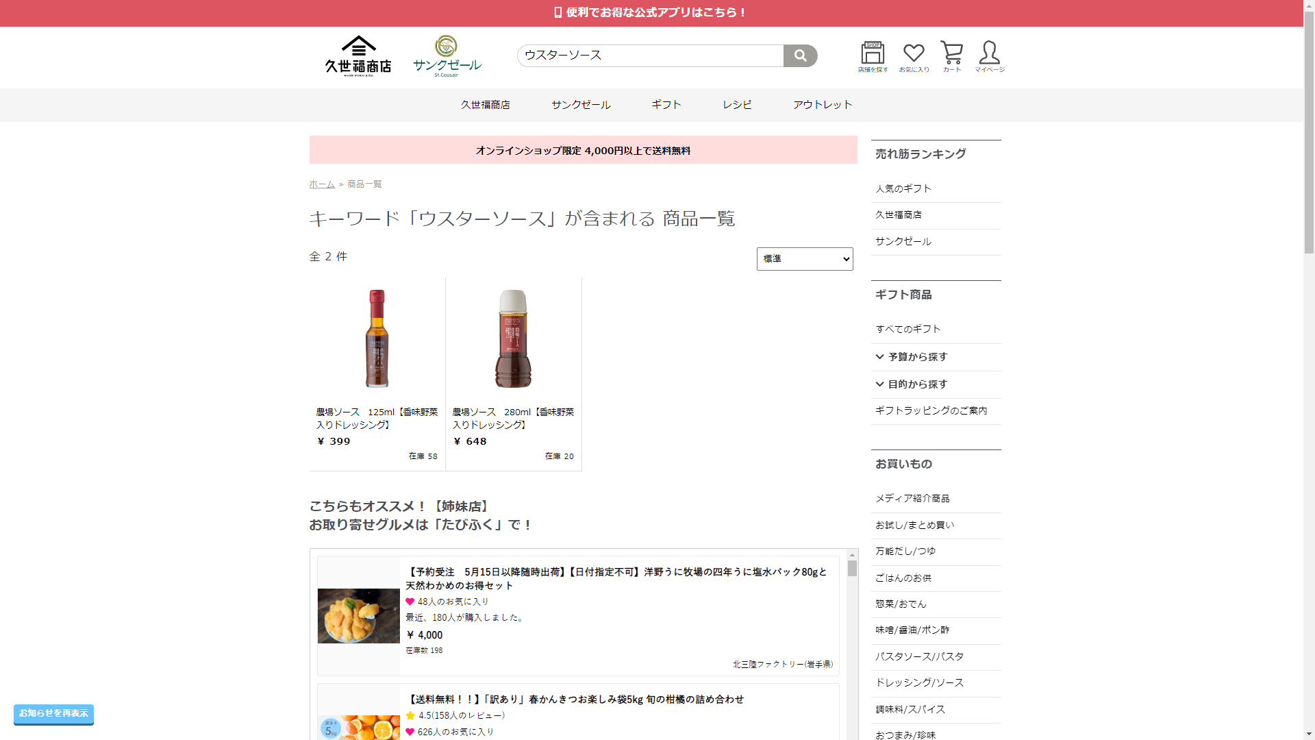 お調べしたところ現在、久世福商店ではウスターソースに関連する商品が販売されています。